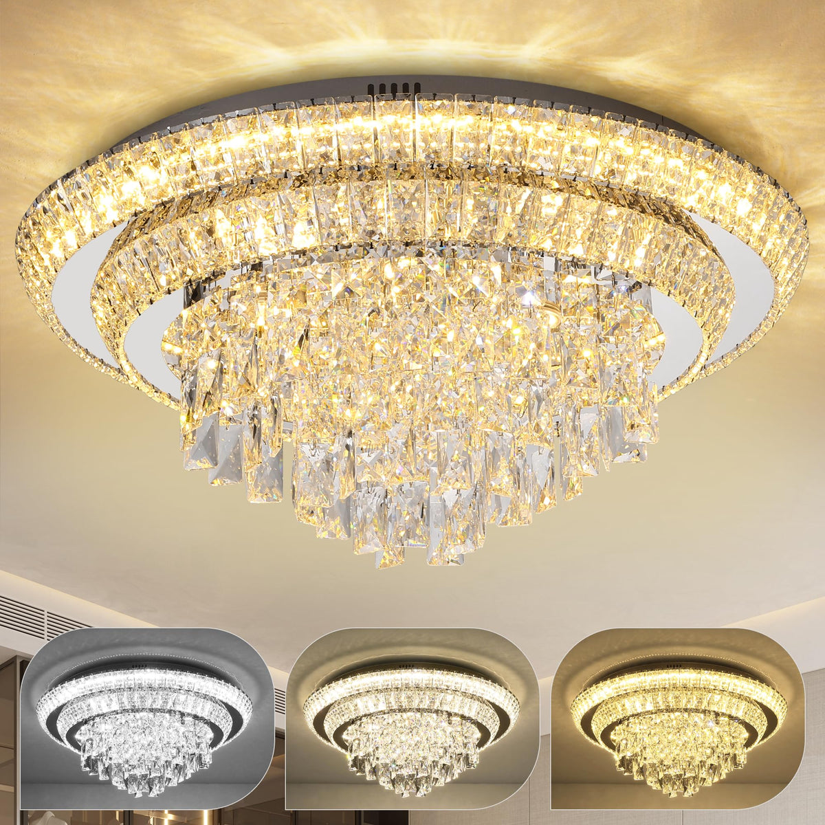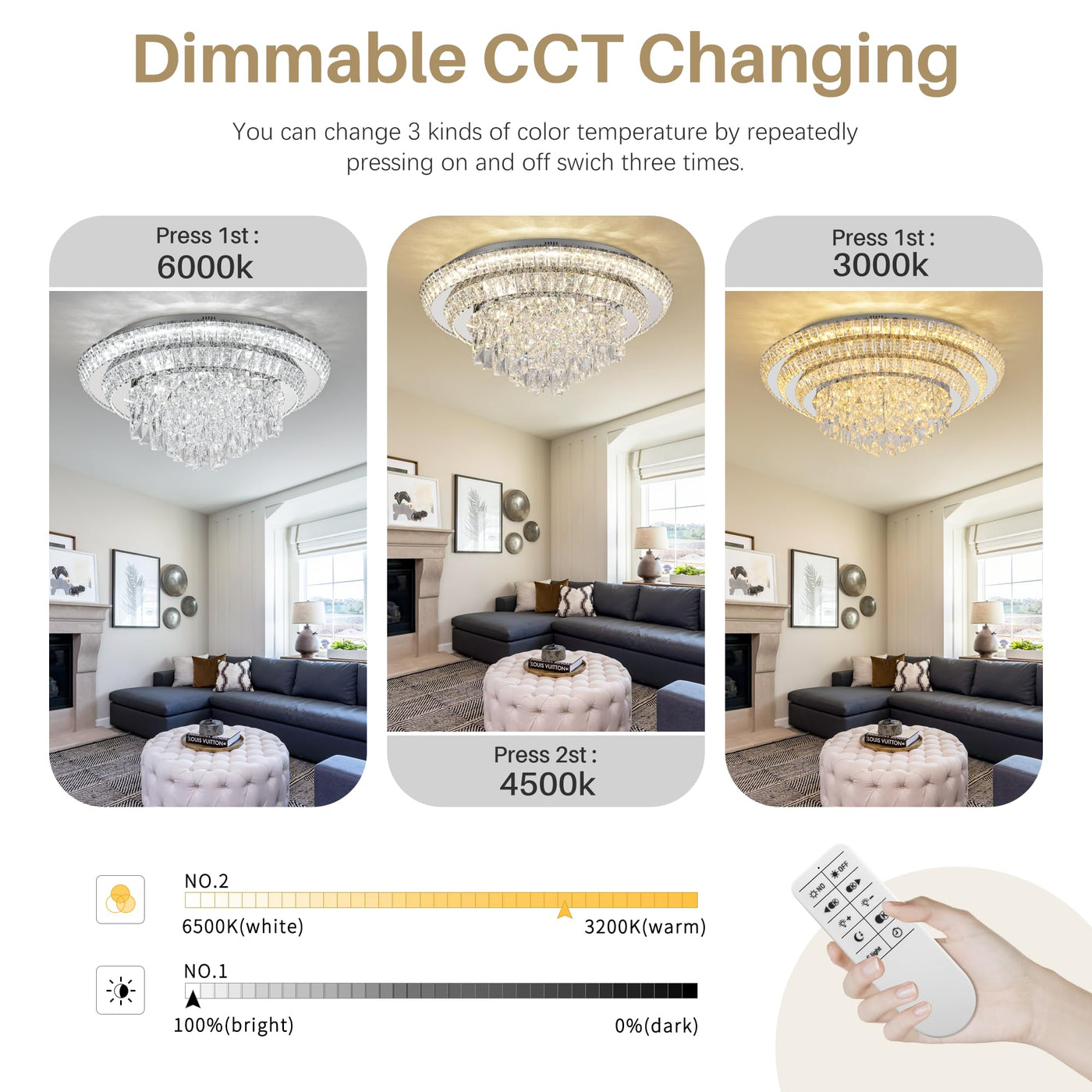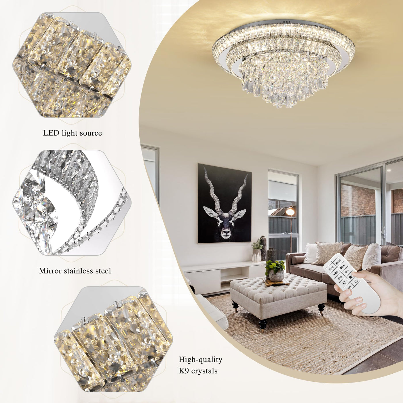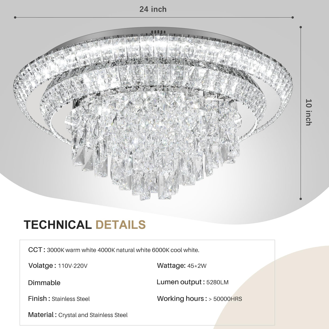 Elegant Crystal Flush Mount Light Fixture - Modern Luxury Meets Functionality Transform your space with our stunning **24'' x 12''H Crystal Flush Mount Light**, designed to elevate any room with its sophisticated two-layer LED light sources. Each layer boasts a powerful 45W output, delivering brilliant illumination while maintaining a sleek, close-to-ceiling profile. The elegant design features a polished 24'' x 1.57''H canopy and a 10'' lamp height, making it a perfect blend of modern aesthetics and timeless charm. Customizable Ambience for Every Mood Create the perfect atmosphere with ease! Our light fixture allows you to effortlessly adjust between three color temperatures-**3000K warm white** for a cozy vibe, **4000K natural white** for balanced brightness, and **6000K cool white** for a crisp, energizing glow. The included remote control takes customization to the next level, letting you fine-tune both color temperature and brightness to match your decor or mood seamlessly. Premium Quality & Energy Efficiency Crafted with **high-quality K9 crystals** and **rust-resistant stainless steel**, this fixture is built to last. The integrated LED chips are not only energy-efficient but also easy to maintain, helping you save on energy bills while enjoying long-lasting, dazzling light. Versatile for Any Space Whether its your hallway, bedroom, kitchen, living room, or balcony, this crystal light fixture adds a touch of modern luxury to any setting. Its versatile design complements a wide range of interior styles, making it a perfect choice for foyers, walk-in closets, dining rooms, and more. Hassle-Free Installation & Reliable Support Weve made installation a breeze! All parts are clearly labeled, and the step-by-step instructions guide you through mounting the top plate and attaching the crystals. If you have any questions, our dedicated customer support team is just a message away, ready to assist you within 24 hours. Upgrade your home lighting with this exquisite crystal flush mount light-where elegance meets practicality, and every detail is designed to impress.