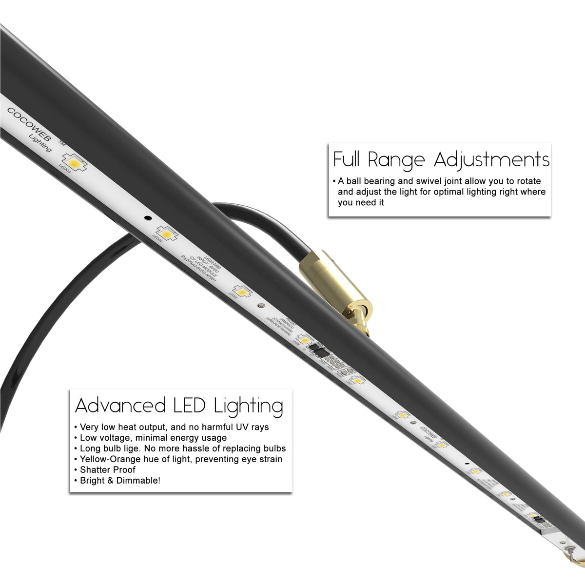 Showcasing the classic lines of this piano lamp and cut from the highest quality solid brass and other metal material, the GPLED19D piano lamp has a black finish that features brass accents and comes with a matte powder-coated finish. Cocoweb LED piano lighting technology makes the GPLED19D a class of its own, unmatched by any other similar lights on the market. Cocoweb LED technology gives piano lighting a leap in energy efficiency and provides lighting color that resembles natural sunlight. The LED lighting array is pre-installed and included in with GPLED19D. These LED light bulbs consume less than half the electricity of traditional light bulbs, while providing ample illumination. The powder coating ensures a lifetime of use, free from scratching and marring. Cocoweb GPLED19D provides an LED light source of more than 15 inch long. Most piano books are about 15 inch -16 inch when open to play. The light also has a color temperature of 2700K that resembles natural sunlight which relieves strain on the eyes. Each Cocoweb piano lamp is rolled, polished, buffed, sprayed and inspected for maximum quality. The GPLED19D features an elegant black finish with brass accents. There is no need for a replacement of these LED light bulbs for 50,000 hours! usually, this means 20 years of use without replacing the light bulbs (bars).