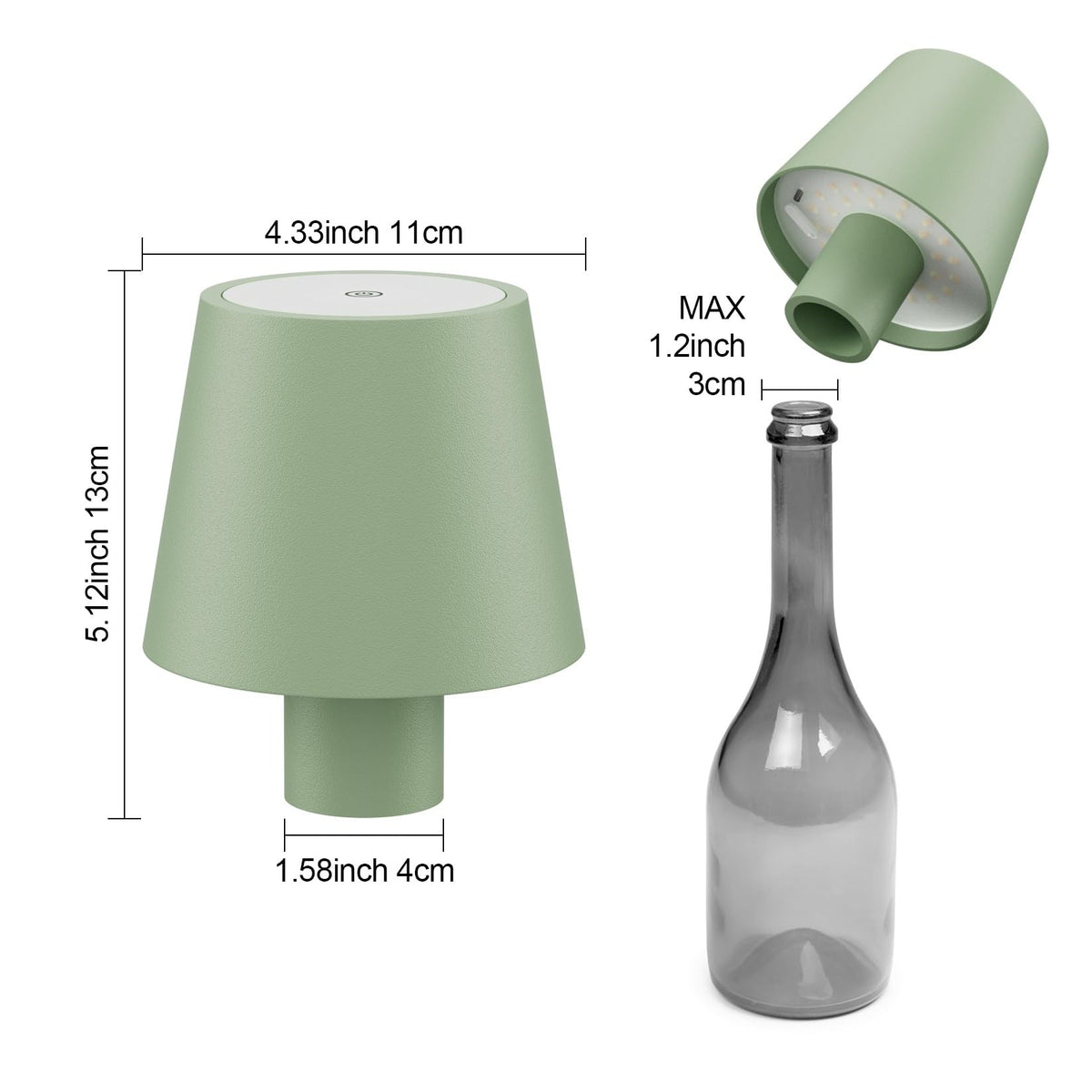 ??3 Color & Stepless Dimming?Touch on/off to switch between 3 color temperatures: Warm Light, Cool light, Natural light. Long press to control the brightness of the light (5%-100%).|??Portable Battery Powered?Battery operated bottle lamp has a built-in 5500aAh high-quality rechargeable battery. Using the USB-C charging port (included). Charging time 5-6 hours, Working time for 12-48 hours. (Use the included 5V 1A-2A charging cable to avoid any potential damage to the battery.)|??IP54 Waterproof? This portable bottle table lamp is made of high quality aluminum, IP54 protection class technology without worrying about water ingress, can be applied to various outdoor occasions.|??Wide Application?This bottle light is suitable for bottle neck within 1.2inch/3cm in diameter. Our table lamps are very suitable as gifts for family and friends. The small table lamp is suitable for many scenes, such as bedside table, dining table, living room, bar, indoor and outdoor lighting, etc.|??After-Sale Service?We offer 100% satisfaction service. If you have any questions about our products, please contact us and all problems will be solved within 24 hours.