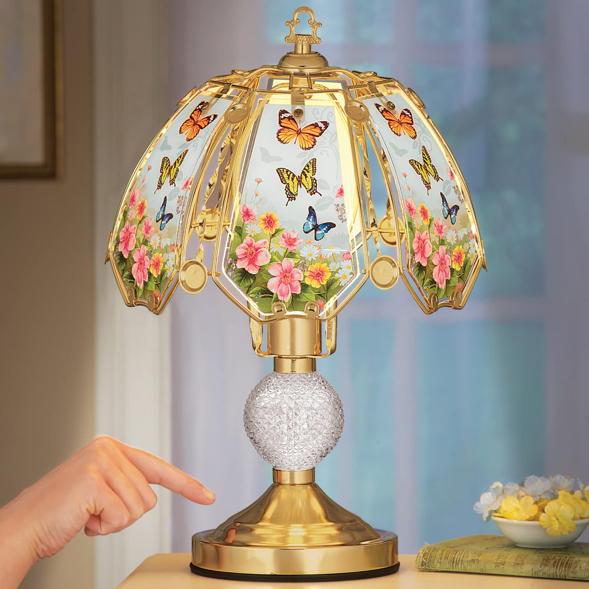 Collections Etc Floral Butterflies Glass Shade 3-Light Touch Lamp - 16 1/2 HDescriptionBrighten up your d cor with this lovely lamp that features colorful butterflies flying above a colorful garden. The elegant design features glass panels atop a gold-toned base. It has three brightness levels, and you simply touch the base to turn it on and off. Perfect for your desk or bedside table. One 40-watt bulb required (not incl.). Glass and iron. Approx. 10 3/4Dia. x 16 1/2H. Lamps are compatible with 40 watt maximum incandescent light bulb only. Not compatible with LED/CFL bulbs .Material TypeIron,Glass