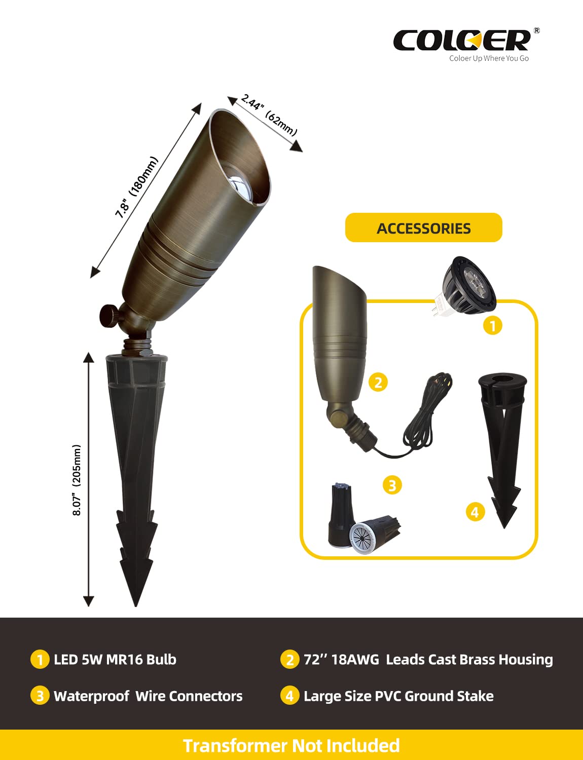 Q: What is the best way to install the COLOER Brass Landscape Spotlights?A: The COLOER Brass Landscape Spotlights come with a cleated heavy-duty stake design, making installation easy. Simply insert the stake into the ground, and you can adjust the spotlight for up to 180° vertically and 360° horizontally for optimal illumination.