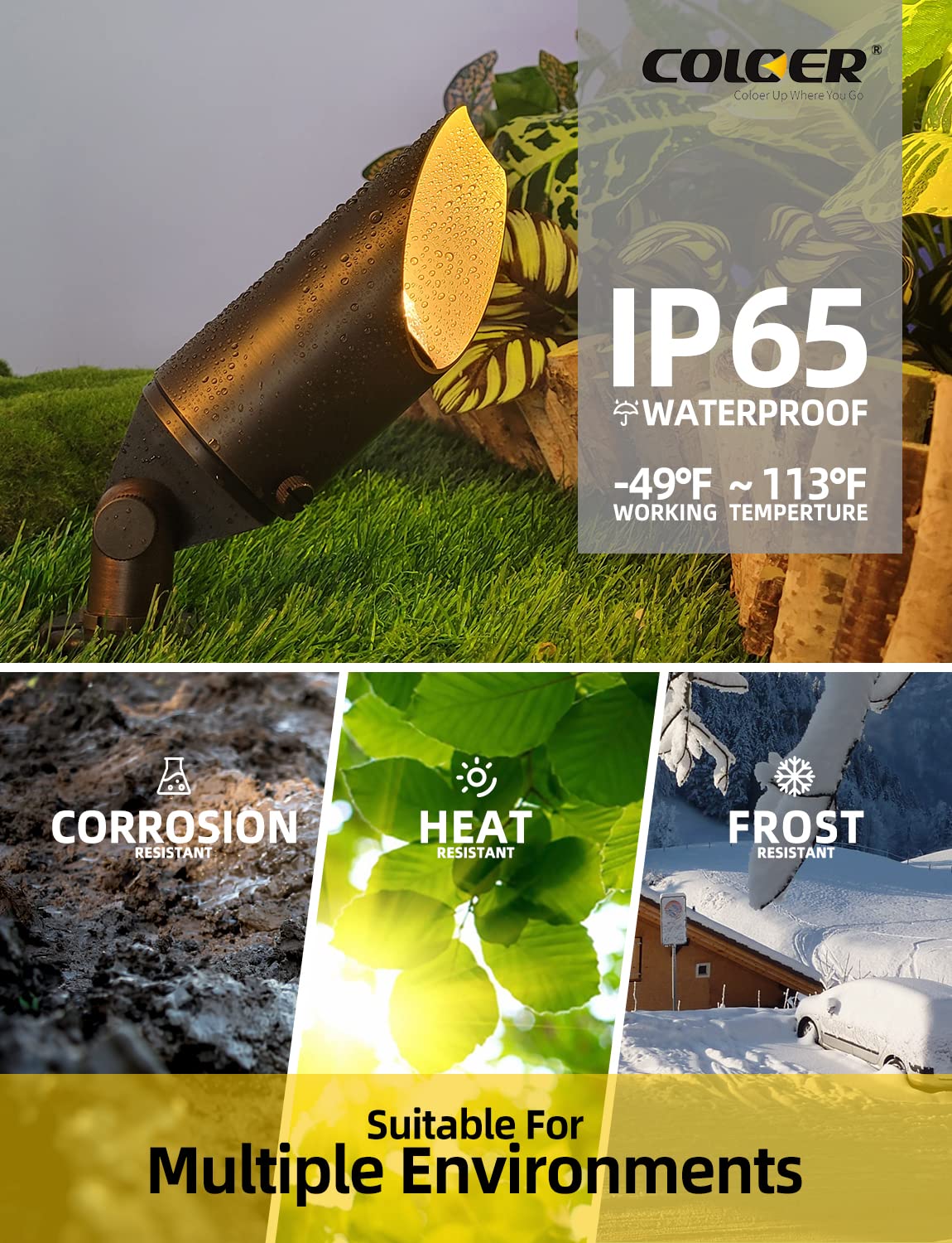 Q: Is the COLOER spotlight waterproof?A: Yes, the spotlight has a special waterproof design, including a double silicone O-ring to ensure water resistance. This feature protects the lead wire exit from ground moisture, making it suitable for outdoor use.