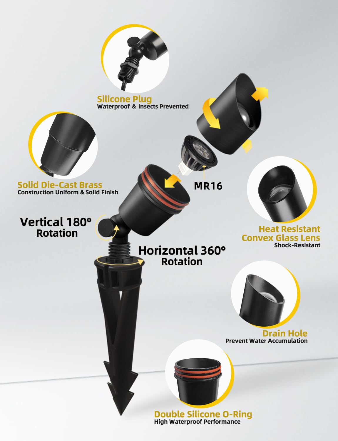 Q: What materials are used in the construction of these spotlights?A: The COLOER landscape spotlight is made from durable die-cast brass, providing superior corrosion and pressure resistance compared to aluminum and plastic options. The black finish enhances its aesthetic appeal while ensuring longevity.