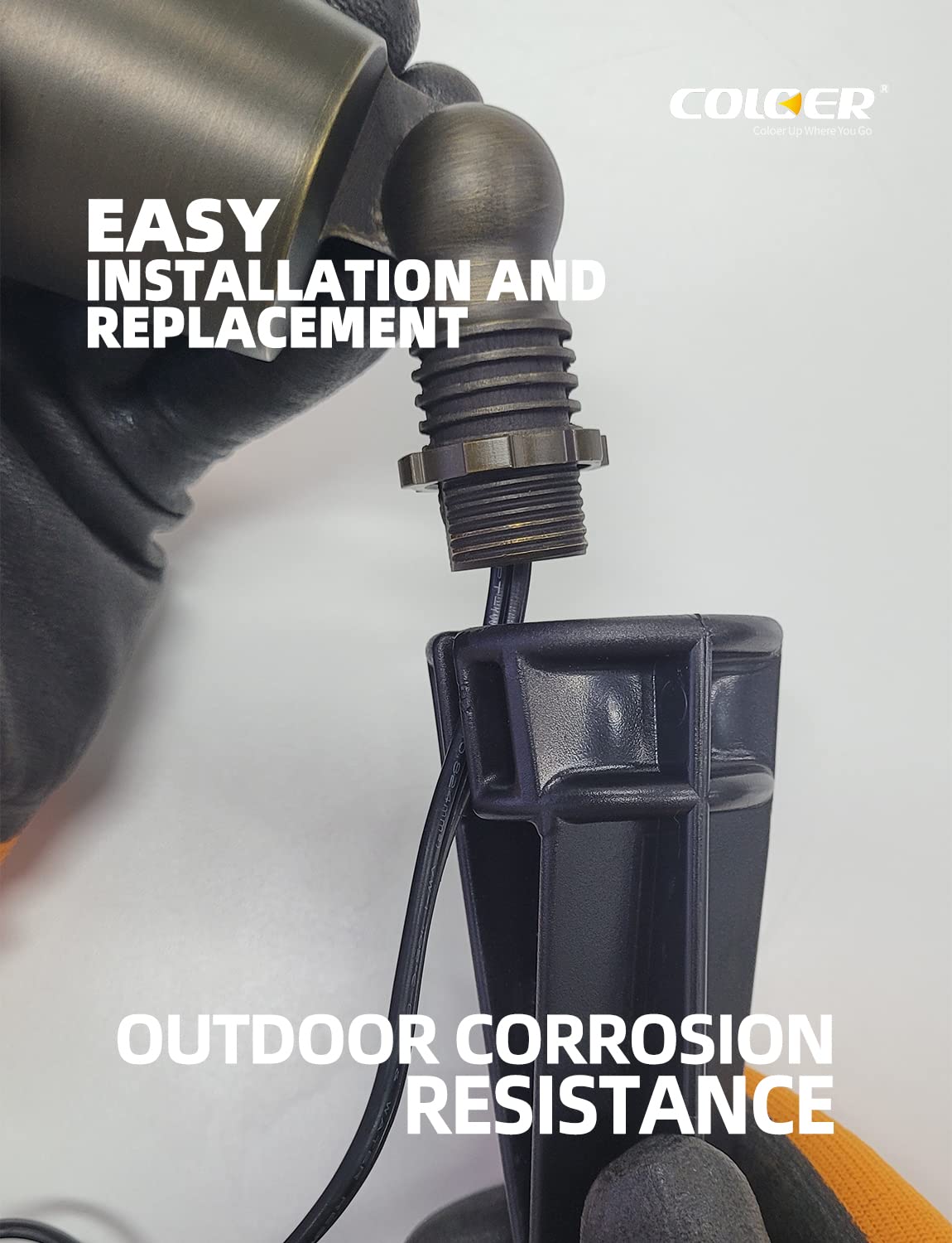 Q: How do I install the COLOER landscape light ground stakes?A: Installation of the COLOER landscape light ground stakes is easy due to their flat top and threaded base design, allowing you to securely mount your light fixture and force the stake into the desired ground area.