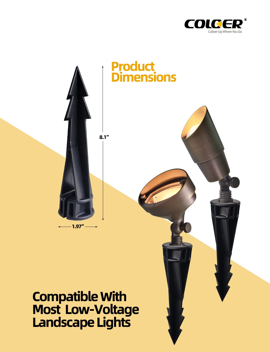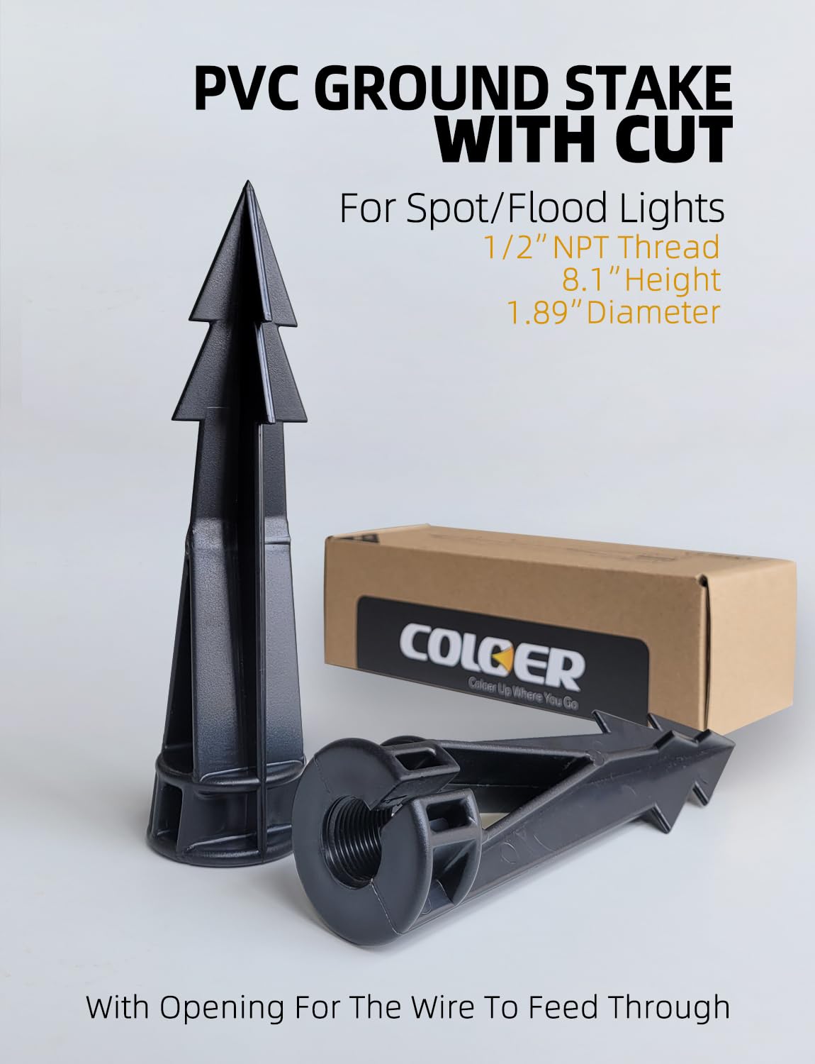 PVC landscape lights ground stake spikes replacement, 8.1" high and 1.97" diameter, 1/2" NPT thread, perfectly blend with COLOER brass path lights and most other brand landscape lights.Our landscape light ground stakes for path lights are widely use for outdoor environment, allow the garden light fixture to be directly buried into different terrains including grass, flowerbeds, gravel and more.