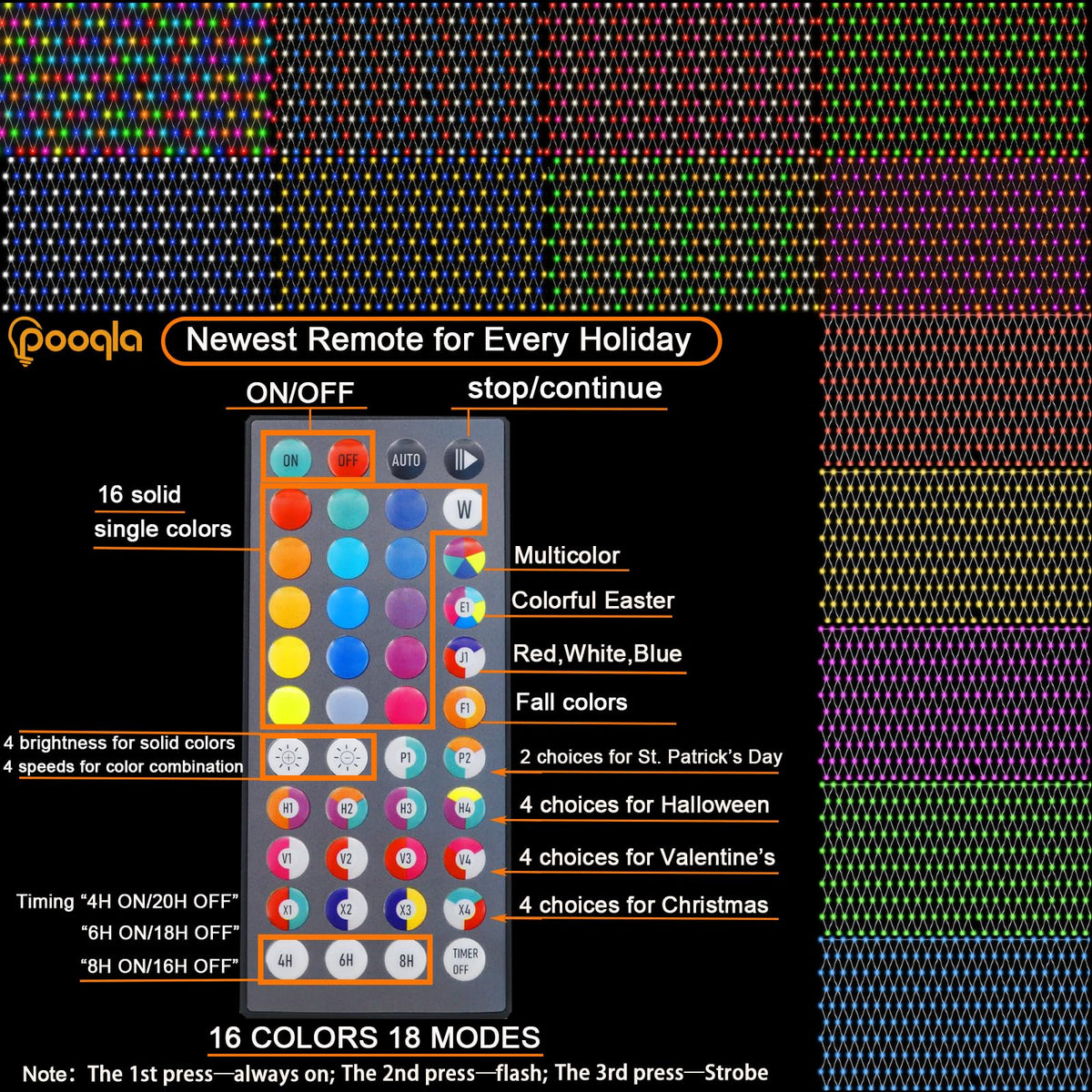 Q: What are the main features of the Color Changing Net Lights?A: The Color Changing Net Lights come with an upgraded 44 keys remote control that offers 16 solid colors and 18 additional color combinations for various holidays. It includes 3 lighting modes (steady, flash, strobe) and allows for 4 levels of brightness and speeds for the effects.