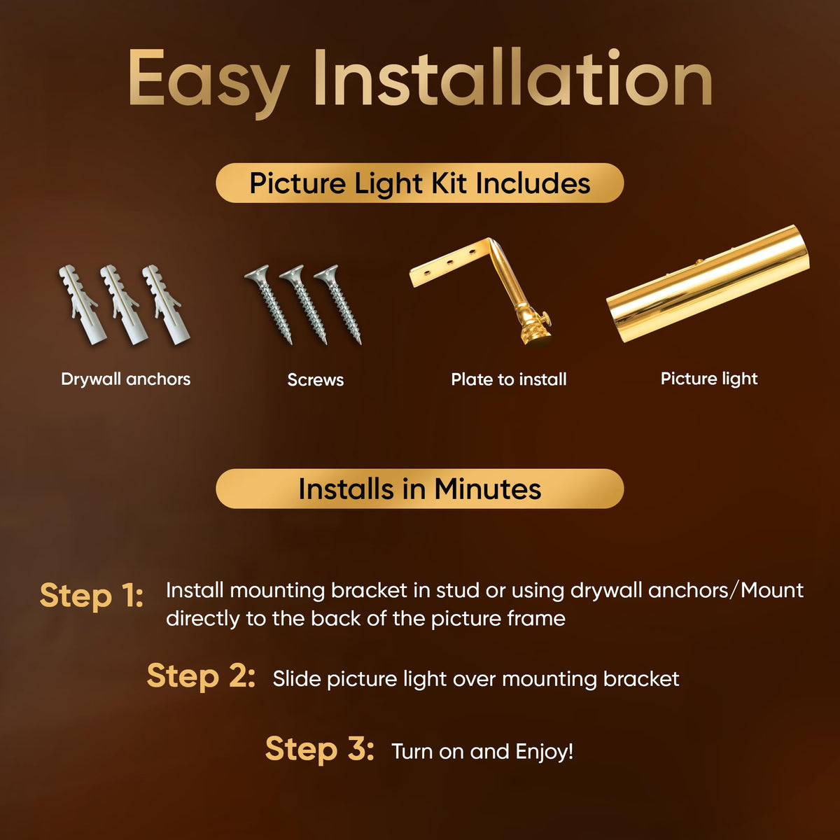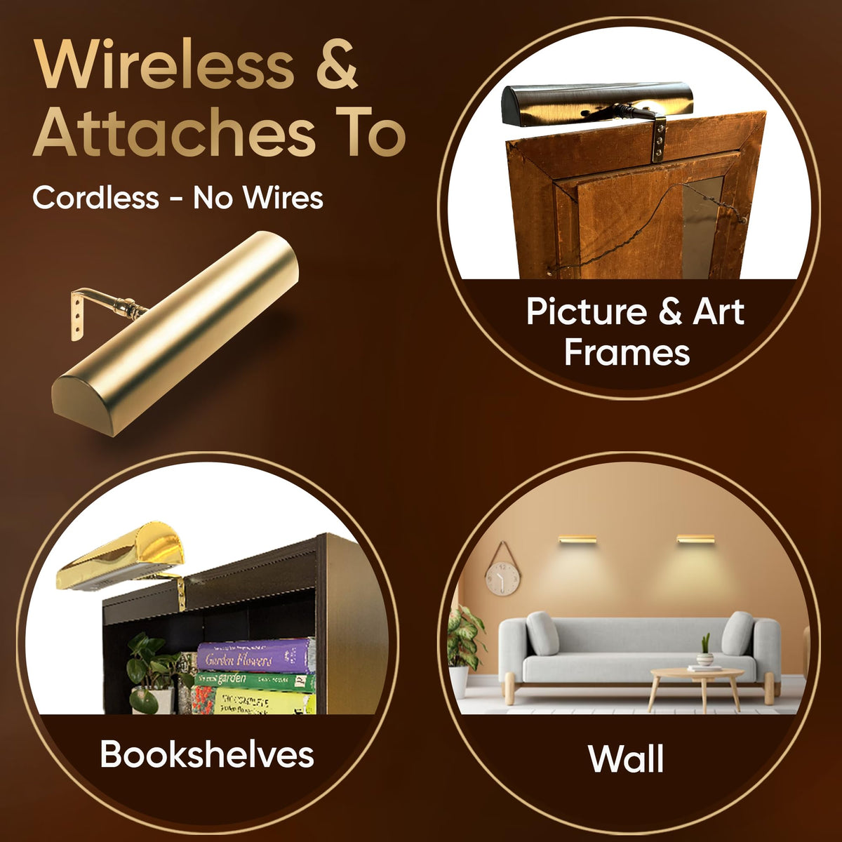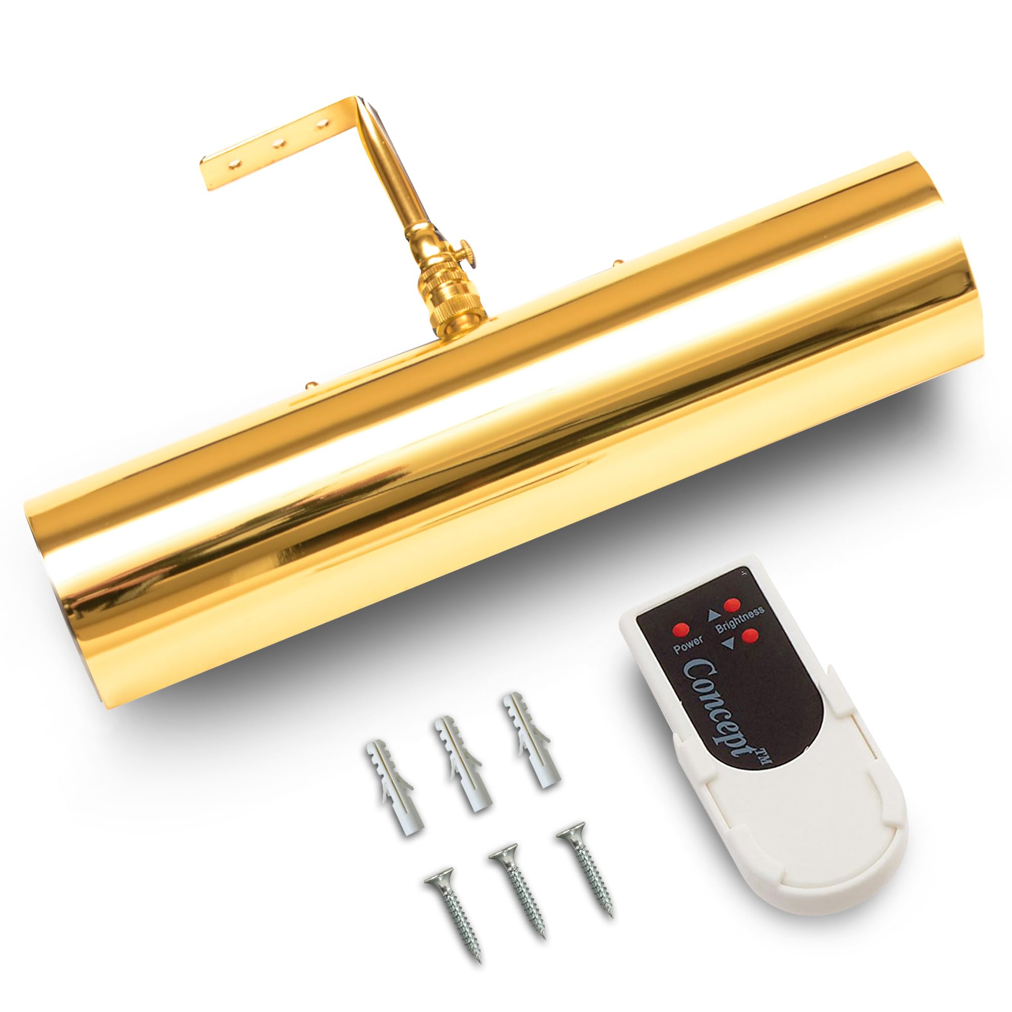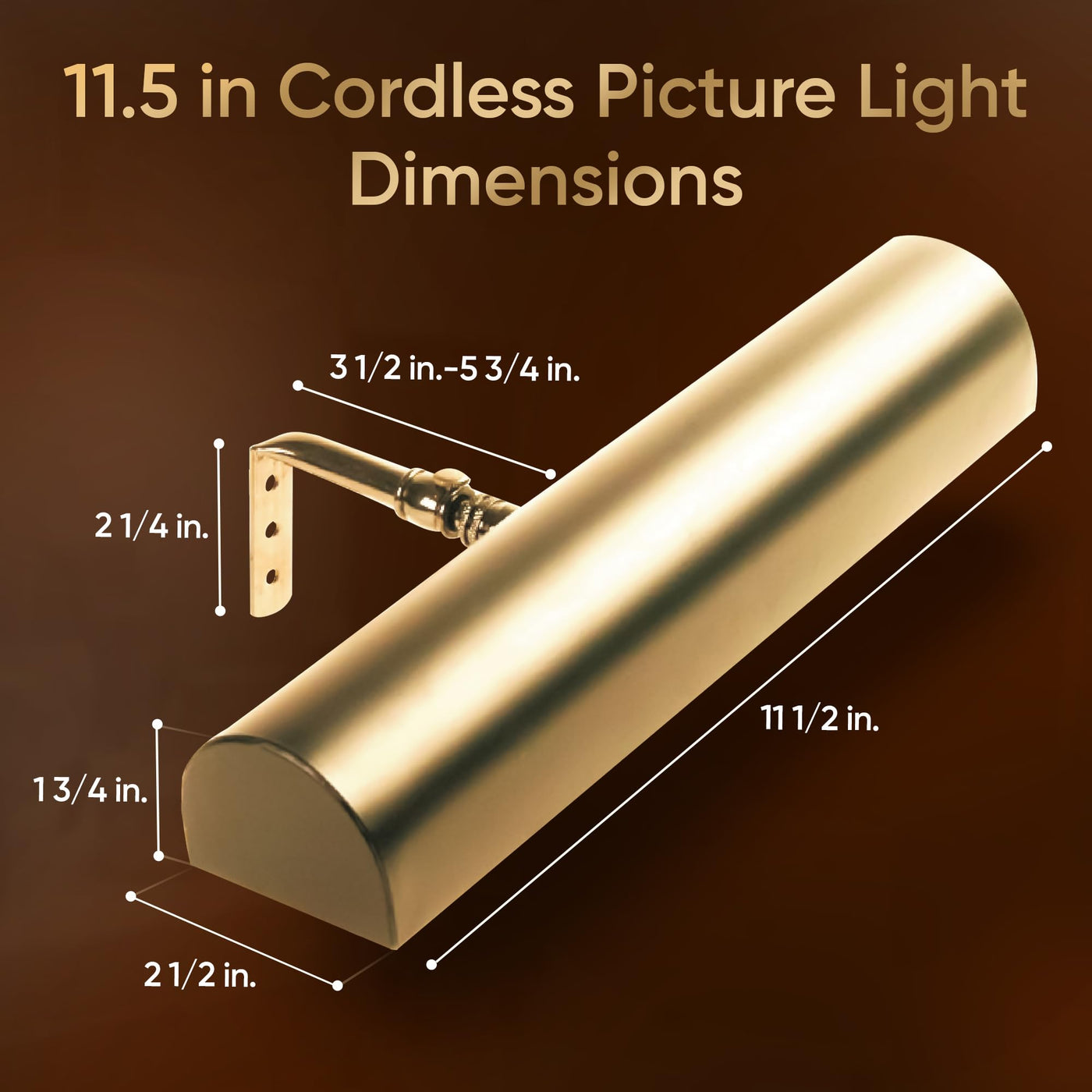 Product DescriptionThis LED wireless battery operated picture light with remote mounts to the wall or to the picture frame directly.Features: Dimmable with 4 settings Warm White SMD LED bulbs (3200K) Auto off after 5 hours setting Tilting head mechanism Safe for artwork - NO UV/no heat Easy installation mounts to wall, picture frame or bookshelf (hardware included) Use one Remote Controller for multiple lights Maintenance-Free LEDs last virtually forever due to their 50,000 hour ratingVersatile for use: Wall Mount Picture Frame Mount Bookshelf Art gallery Portraits Office Bedroom BathroomChoose from 4 finishes: Gold Polished Brass Brushed Antique Bronze Matte Black Satin NickelDesign for any d cor style: Modern Vintage Traditional TransitionalChoose 3 sizes: 7.75 inch-uses 3 C batteries and 2 AAA batteries for remote control 11.5 inch- uses 4 D batteries and 2 AAA batteries for remote control 18 inch- uses 8 C batteries and 2 AAA batteries for remote controlOur lights last up to: 7.75 in light - 80 hours (highest setting)/160 hours (lowest setting) 11.5 in light - 100 hours (highest setting)/200 hours (lowest setting) 18 in light - 80 hours (highest setting)/160 hours (lowest setting)The warm white light is 3200k and on the brightest setting the light output is: 7.75 in light - 65 lumens 11.5 in light - 95 lumens 18 in light - 125 lumensHow to Choose a Size: 7.75 in light - for art up to 28 in wide 11.5 in light - for art up to 36 in wide 18 in light - for art up to 28 in wideEasy ''Drop-in'' style battery replacement.Advanced solid state circuit using PVM (pulse width modulation) for efficient power deliveryCan use rechargeable lithium batteries (not included)From the ManufacturerThis Cordless Picture Light way outshines any others- Bright, dimmable, over 100 hours of battery life AND Remote Controlled! Advanced solid state circuit using PWM (Pulse Width Modulation) technology provides over 100 hours of life (on brightest setting!). Safe for artwork- No UV/No Heat. Easy installation (wall or frame mounted). Remote Control with dimming included. (Light can be controlled by remote or on main unit). Use one controller for multiple lights. For pictures up to 3 feet wide. Easy ''drop-in'' style battery replacement. *100 hour rating measured by cycling at 12 hours of operation with a 2 hour rest period in between (on brightest setting) using alkaline batteries. Better performance-up to 150 hours total operation- under realistic conditions of 4-5 hours (one evening's use) at a time. The maintenance free LEDs last virtually forever due to their 50,000 hour rating. They provide an unparalleled warm white color temperature and superior dispersion of light as compared to traditional LEDs for a warm, even glow over artwork.