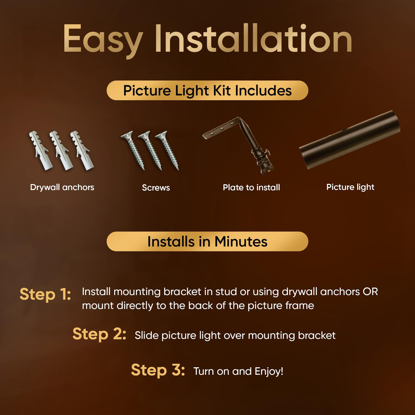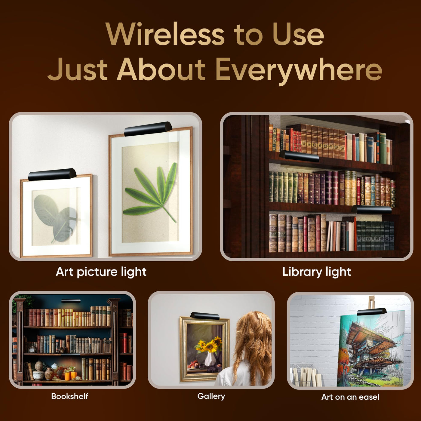 This LED wireless battery operated picture light with remote mounts to the wall or to the picture frame directly.Features: Dimmable with 4 settings Warm White SMD LED bulbs (3200K) Auto off after 5 hours setting Tilting head mechanism Safe for artwork - NO UV/no heat Easy installation mounts to wall, picture frame or bookshelf (hardware included) Use one Remote Controller for multiple lights Maintenance-Free LEDs last virtually forever due to their 50,000 hour ratingVersatile for use: Wall Mount Picture Frame Mount Bookshelf Art gallery Portraits Office Bedroom BathroomChoose from 4 finishes: Gold Polished Brass Brushed Antique Bronze Matte Black Satin NickelDesign for any d cor style: Modern Vintage Traditional TransitionalChoose 3 sizes: 7.75 inch-uses 3 C batteries and 2 AAA batteries for remote control 11.5 inch- uses 4 D batteries and 2 AAA batteries for remote control 18 inch- uses 8 C batteries and 2 AAA batteries for remote controlOur lights last up to: 7.75 in light - 80 hours (highest setting)/160 hours (lowest setting) 11.5 in light - 100 hours (highest setting)/200 hours (lowest setting) 18 in light - 80 hours (highest setting)/160 hours (lowest setting)The warm white light is 3200k and on the brightest setting the light output is: 7.75 in light - 65 lumens 11.5 in light - 95 lumens 18 in light - 125 lumensHow to Choose a Size: 7.75 in light - for art up to 28 in wide 11.5 in light - for art up to 36 in wide 18 in light - for art up to 28 in wideEasy ''Drop-in'' style battery replacement.Advanced solid state circuit using PVM (pulse width modulation) for efficient power deliveryCan use rechargeable lithium batteries (not included)