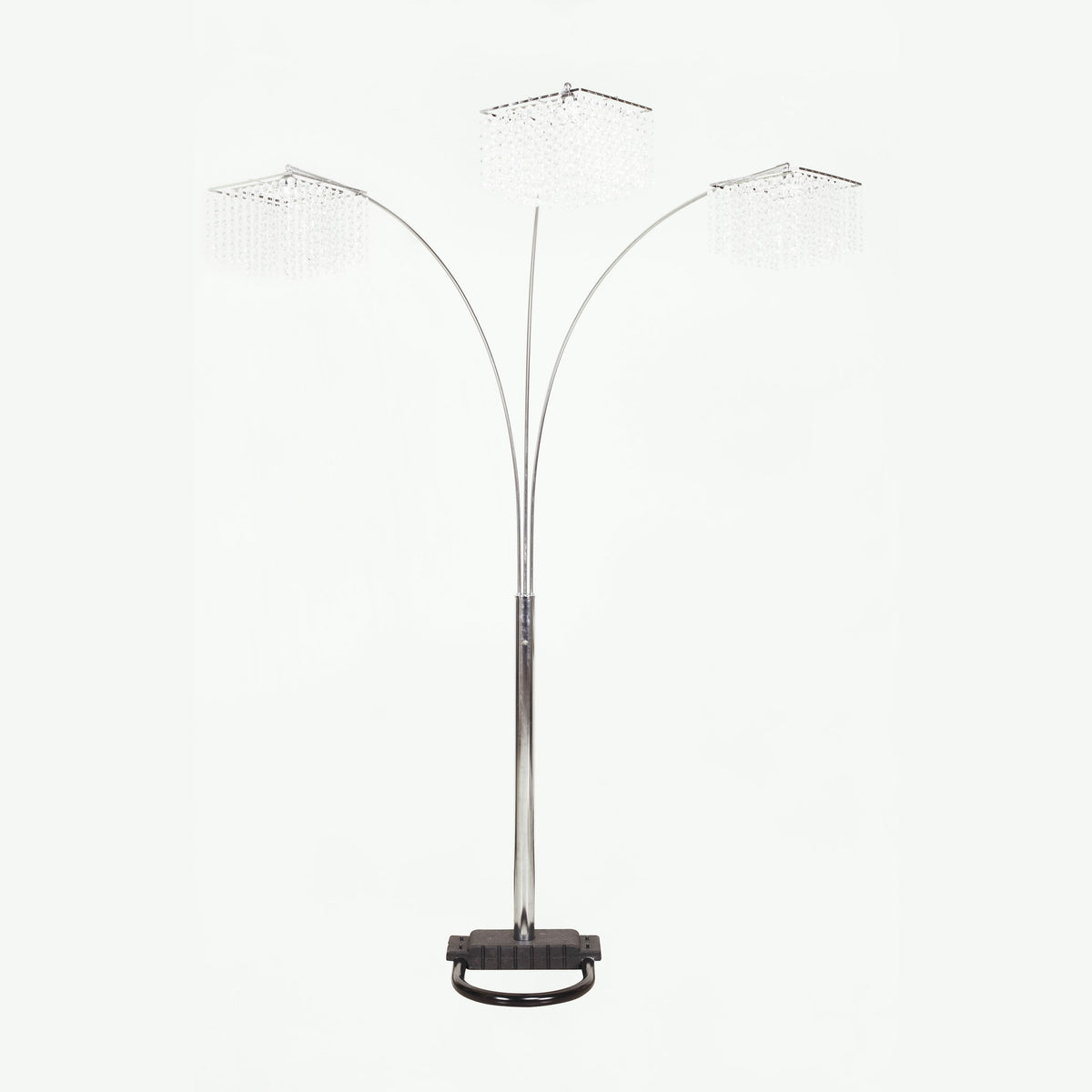 Outfit your contemporary themed home with a glam appeal by adding this Arc Floor lamp. Constructed from silver finished metal with a black U shaped base for stability, this lamp features 3 arched rods that suspend lights surrounded by crystals to add romantic charm to your space when illuminated.