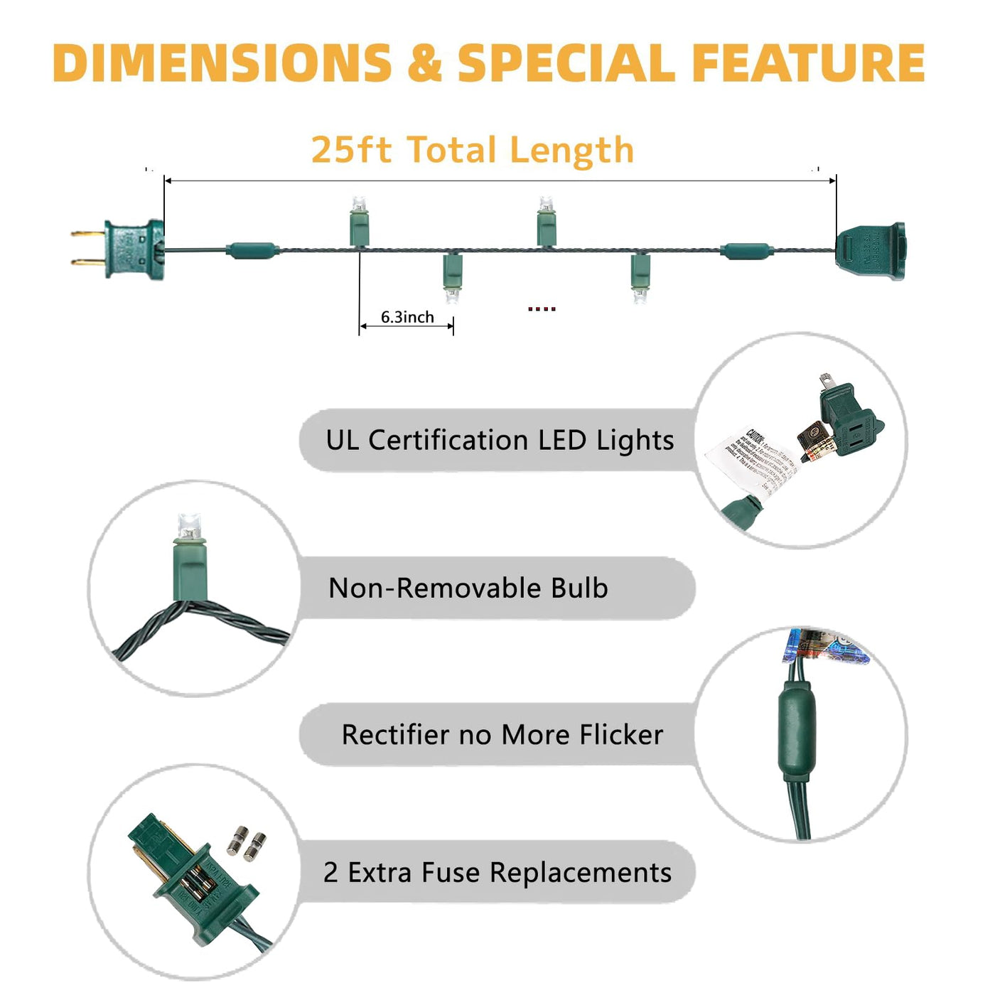 Q: What is the length and count of the lights in this product?A: This product features a length of 25 feet with a total of 50 LED lights, providing ample coverage for decorating trees, buildings, or any festive space.