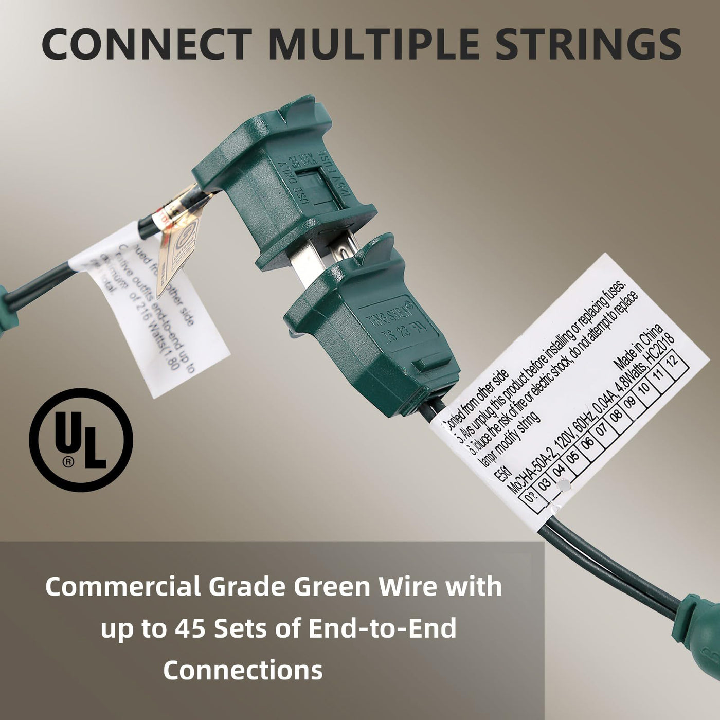 Q: How many strings of these lights can I connect together?A: You can connect up to 45 strings of these LED Christmas lights together, allowing you to cover an impressive total of 1125 feet for large displays and events.