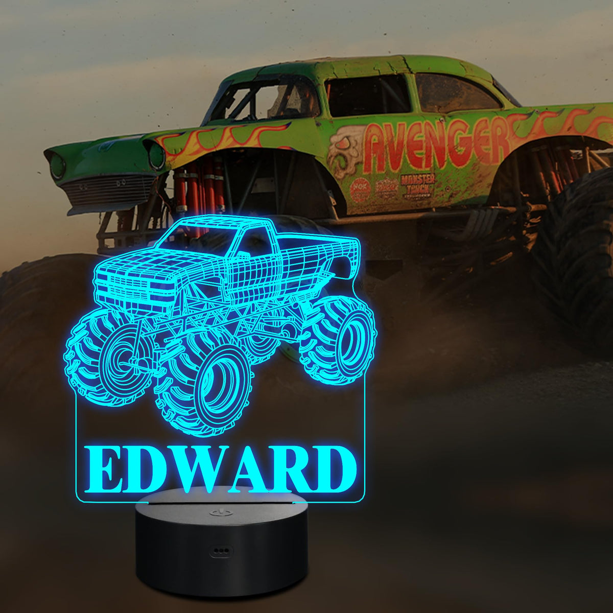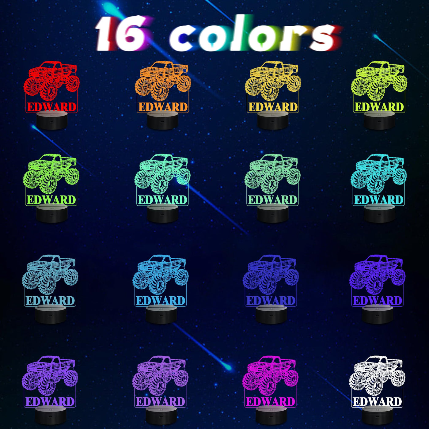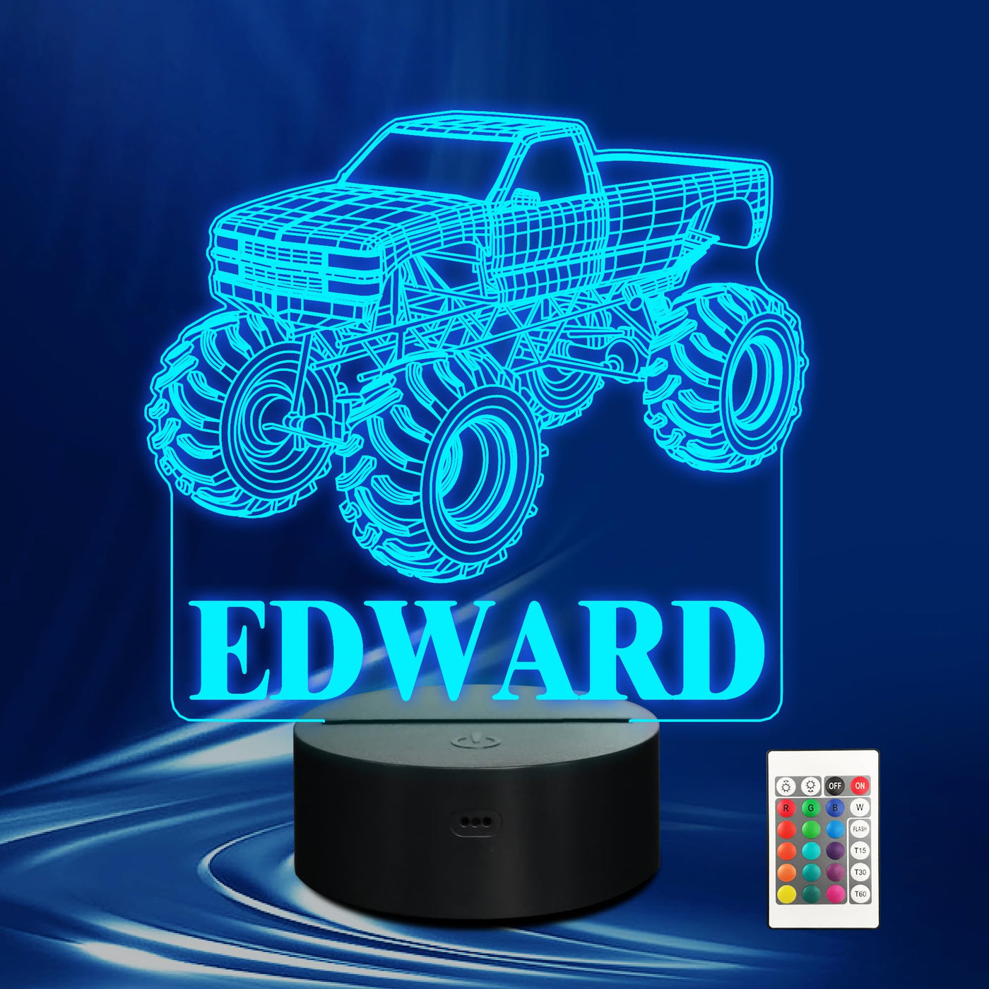 CoolGift Mart Customized Monster Trucks Night Light for Boys, 3D LED Optical Illusion Lamp with Remote Control and Timer, Perfec