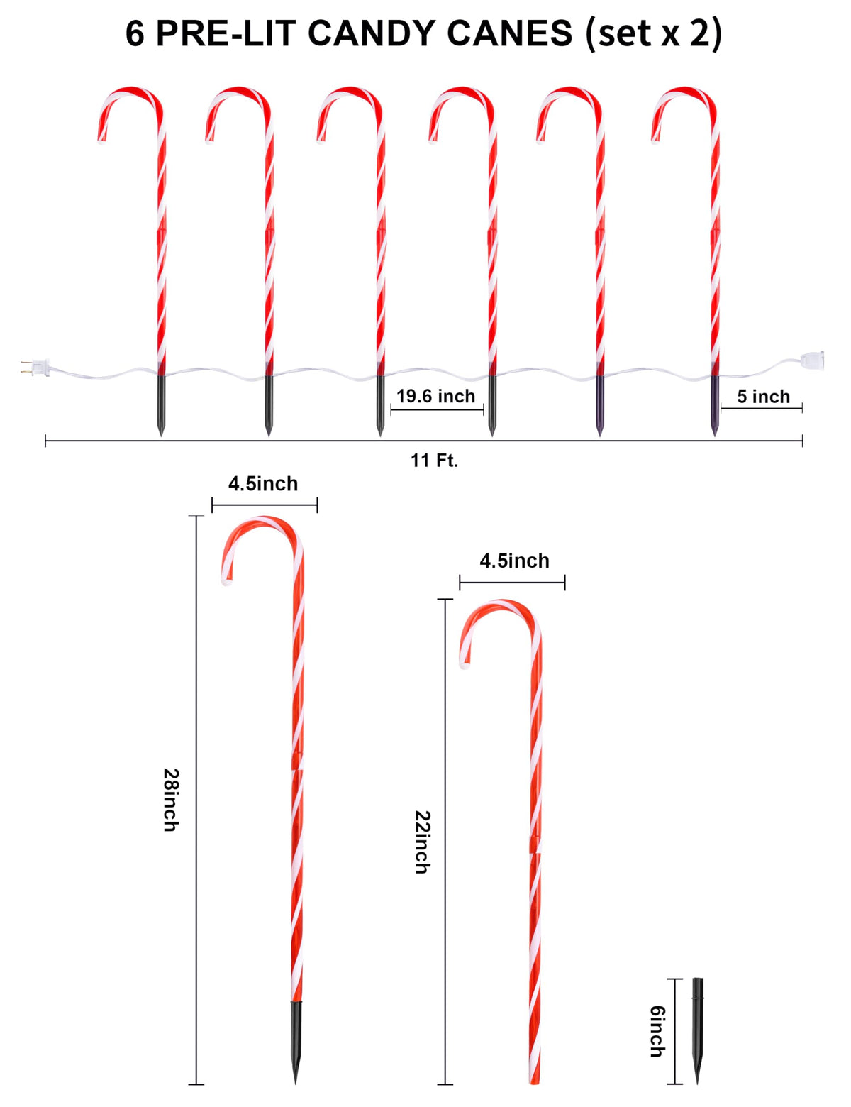 Q: What are the dimensions of the COOLWUFAN Christmas Candy Cane Pathway Markers?A: The COOLWUFAN Christmas Candy Cane Pathway Markers stand at 28 inches tall, including the stakes for secure installation.