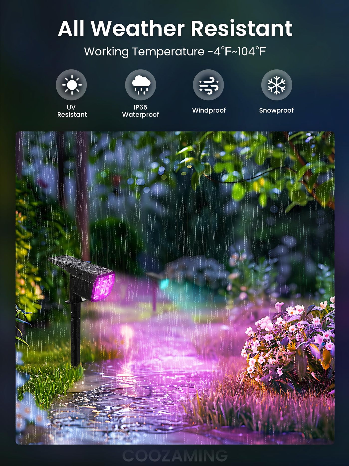 Q: What are the lighting modes available for COOZAMING Solar Spot Lights?A: The COOZAMING Solar Spot Lights feature 9 lighting modes, including 8 static single-color options and 1 dynamic RGB mode, allowing you to create a vibrant atmosphere for any occasion.