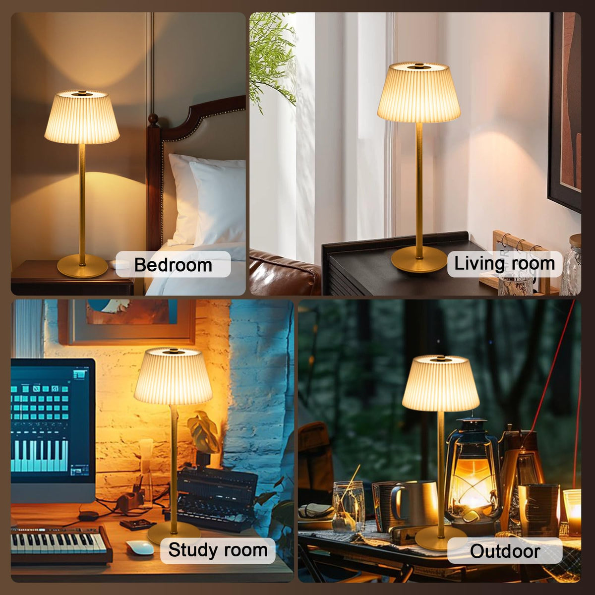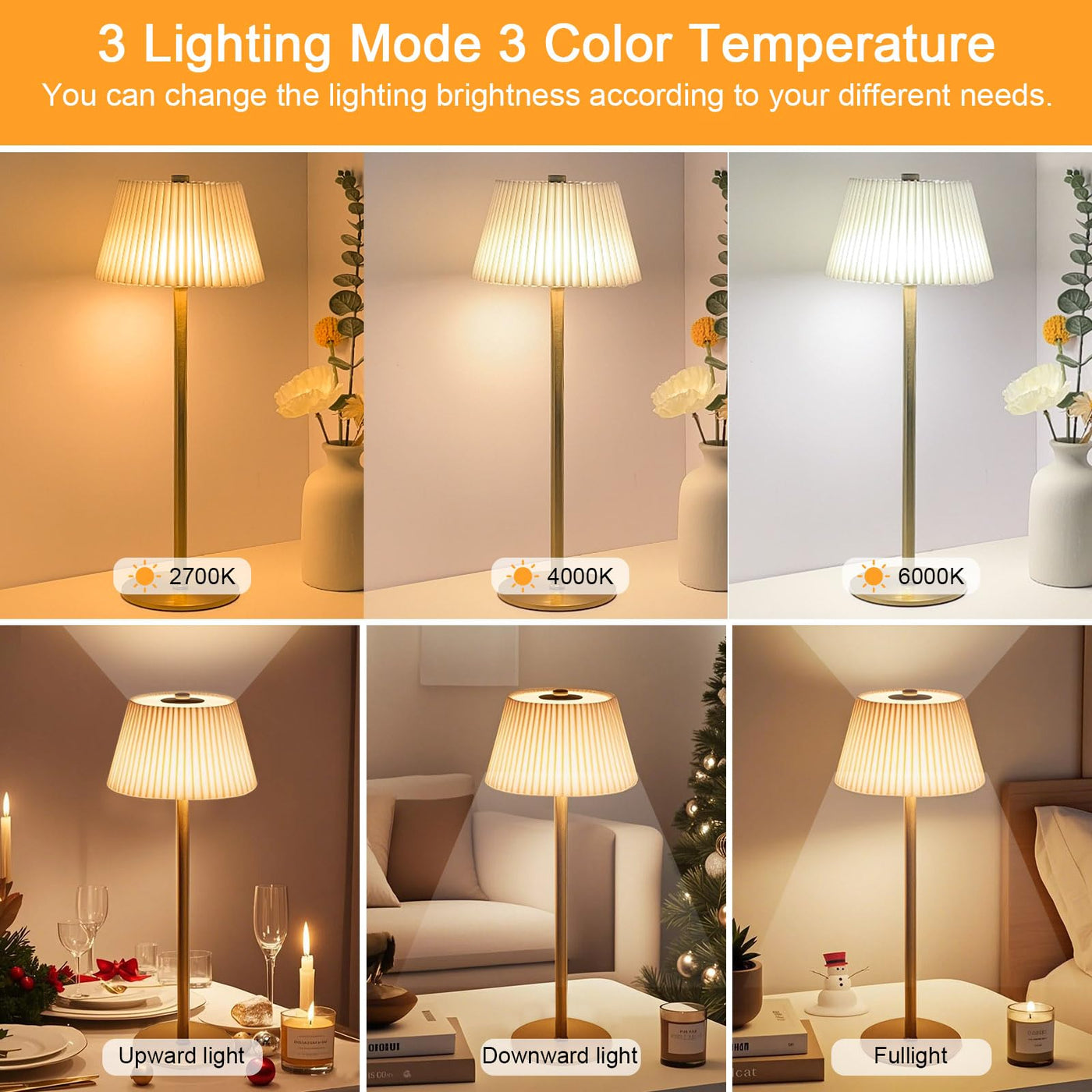 Cordless Table Lamp Rechargeable Small, 4000Mah Led Desk Lamps Gold Fabric Pleated Shade Battery Operated Lamp With 3 Colors Ste