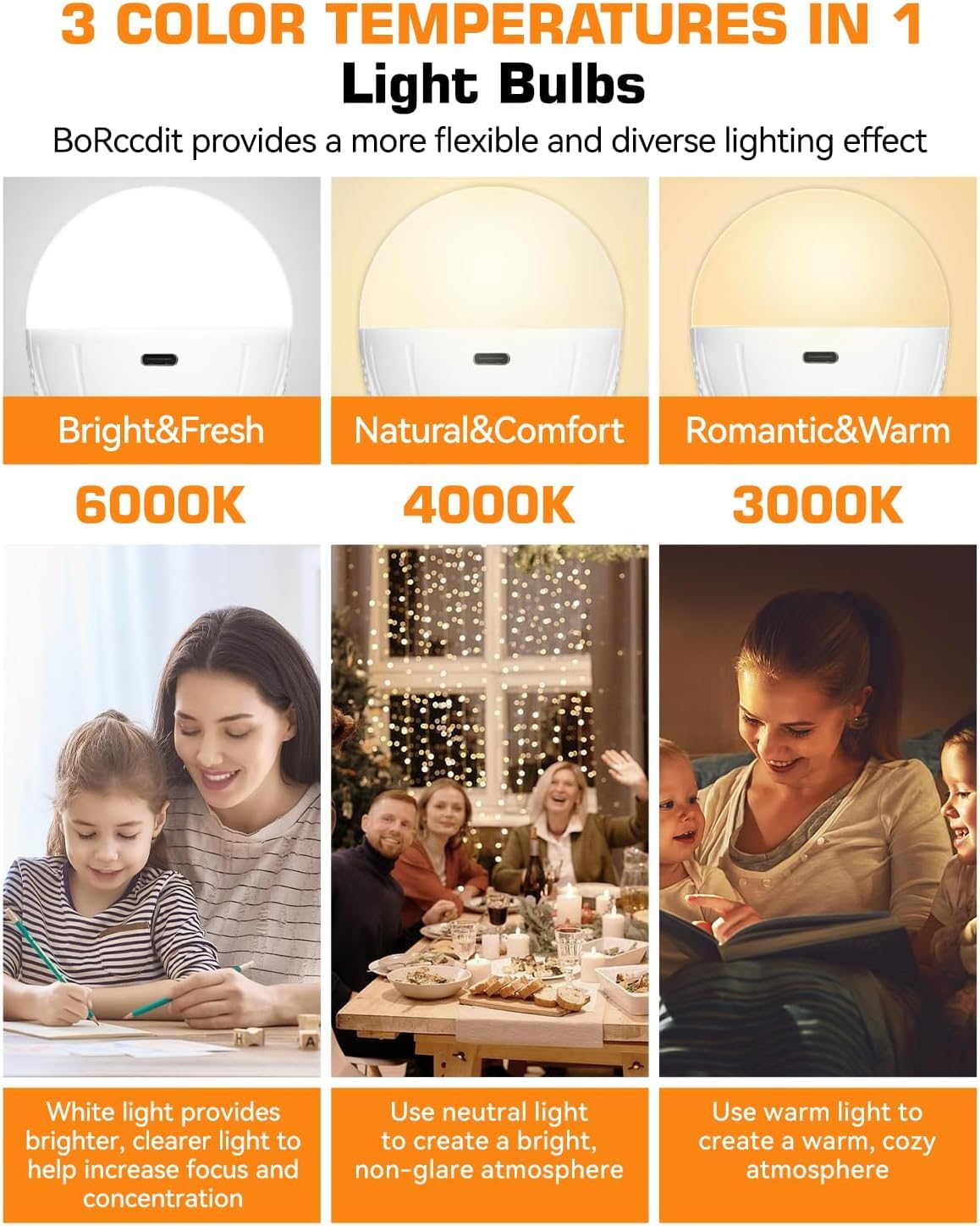 FREQUENTLY ASKED QUESTIONS & ANSWERSQ: How the Battery Operated Light Bulb Charges? A: This battery light bulb has an insulated base and does not supply power to the bulb. The bulb can only be charged via the USB cableQ: Can I replace the battery myself if it gets damaged after long-term use?A: The battery cannot be replaced by the user.Q: How can I use the timer function? A: To use the timer function,press the timer button first, and then adjust the color temperature and brightness using the corresponding remote control buttons as needed.Q: Can I use it on wire-free lamp fixtures? A: Yes, this battery bulb has a built-in 1200 mA rechargeable battery and can be used on E26/E27 lamps without hard-wires. It can only be operated by touch function and remote control. Can also be used on light fixtures with hard wires,only rechargeable via USB.Q: Can I purchase a replacement remote control if it gets lost?A:Replacement remote controls cannot be purchased independently. Please contact customer service to purchase the corresponding model of remote control.Product SpecificationsVoltage: 85-265V 50/60HzSize: A19 Color temperature: 3000K/4000K/6000KDimmable: 10%-100%Time Set: 15/30/60/120 MinutesPower: 15WLumen: 700LM-800LMBattery capacity: 1200mahColor rendering index: > 85Charging Time: 4-5 Hours Working Time: Enjoy up to 4 hours of intense brightness or up to 24 hours of continuous use at the lowest setting.Control Way: Remote Control & Touch ControlPackage includes1* Battery Light Bulb1* Remote Control 1* Charging Cable 1* Hook