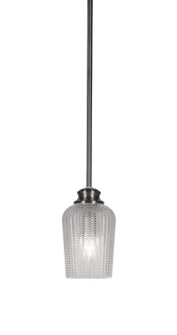 72-BN-4250 Cordova Stem Hung Pendant Shown In Brushed Nickel Finish With 5" Clear Textured Glass. Rated for: Dry location. Light Bulb Data: 1 E26 60 watt. Bulb included: No.