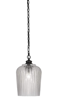 91-MB-4280 Cordova Chain Hung Pendant Shown In Matte Black Finish With 9" Clear Textured Glass. Rated for: Dry location. Light Bulb Data: 1 E26 60 watt. Bulb included: No.