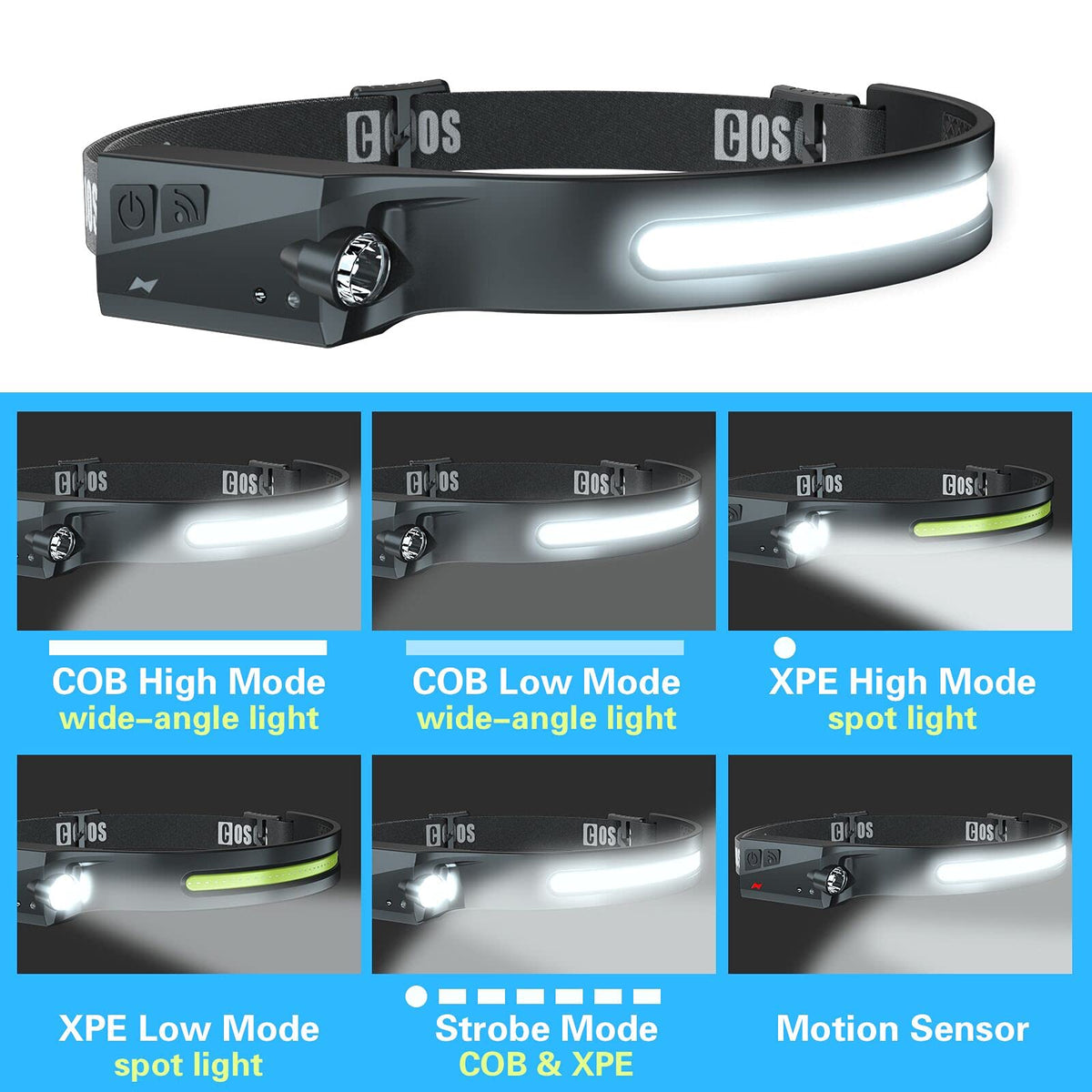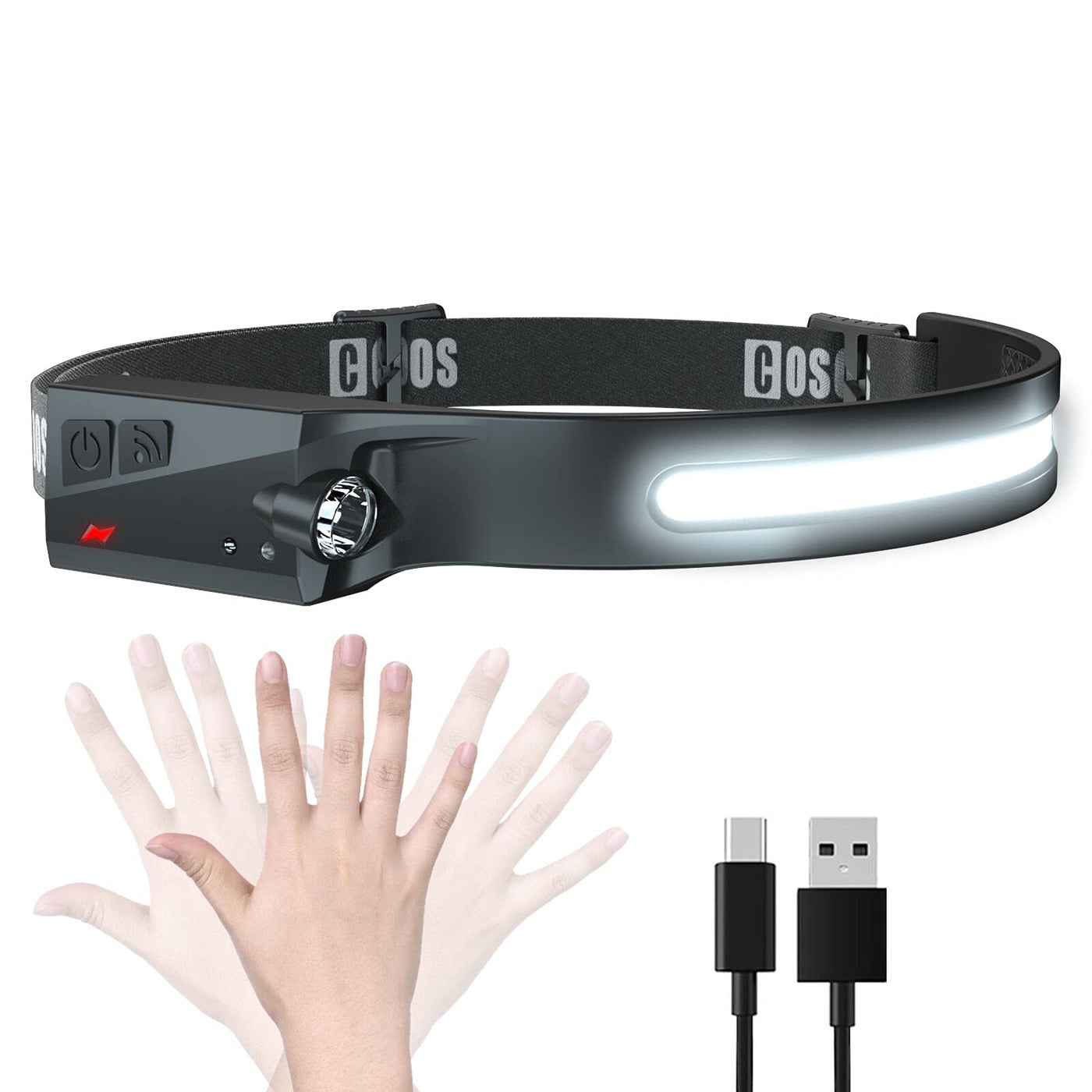 COSOOS Rechargeable LED Headlamp, 1000 Lumen, Motion Sensor, 230° Illumination, Lightweight 2.4oz, Ideal for Camping, Running, Hiking, Black