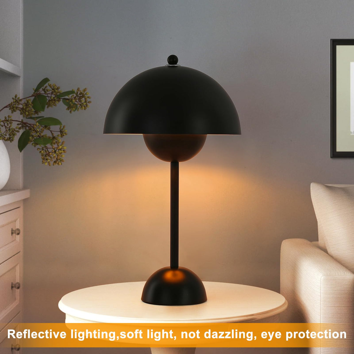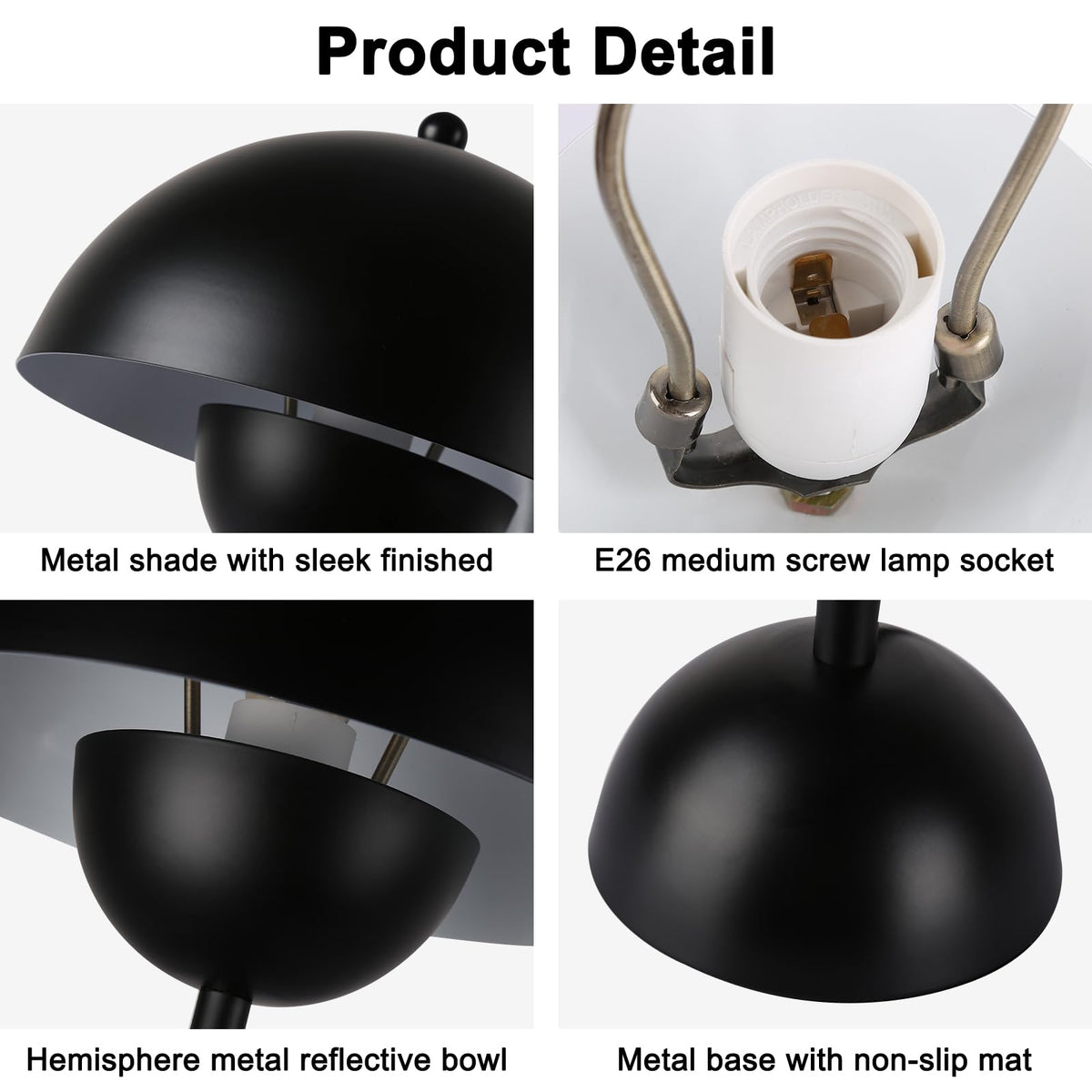 Product type: table lamp, desk lamp Application: living room, bedroom, home office, study room, kid's room, nursery, Style: modern, contemporary, minimalist, mid-century Optional colors: black, white and yellow Product features: reflective lighting, slim figure, wide application Lamp height: 13.4'', 34cm Lampshade size: 9.84inches,25cm(D)?4.92inches,12.5cm(H) Base size:4.72inches,12cm (D) * 2.36inches, 6cm (H) Plug cord length: 63inches, 160cm Lamp base: E26 medium screw socket Voltage: 110V~130V,MAX Power: 40W Compatible light bulbs: LED, RGB Switch type: ON/OFF, push button switch Dimming: Not dimmable. If you need to increase the dimming function, you can buy and replace the dimming switch separately, or use smart plug and RGB bulbs