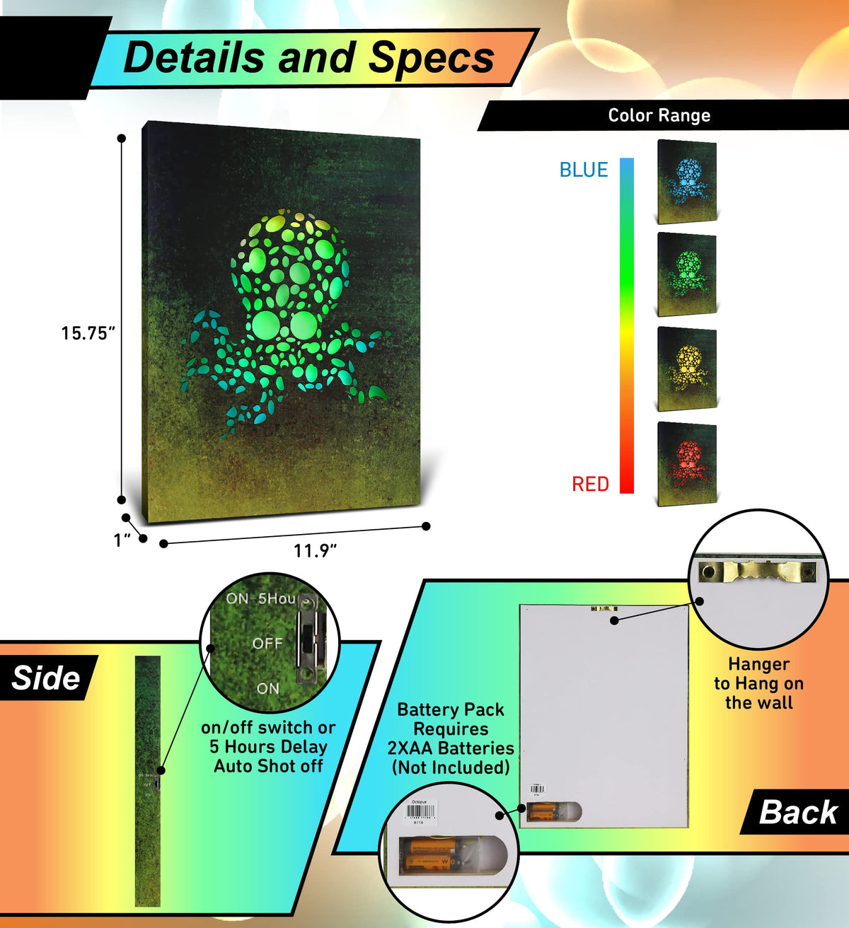 Add a stylish touch of LED light to your home decoration with this lovely Octopus LED light up pictures for wall. The battery powered LED art for the wall makes a perfect accent for every plain wall and provides a soothing and elegant color changing warm light effect for indoor and outdoor spaces. It's the perfect gift for housewarming parties and can be easily hanged on any wall surface. Light up your bedroom, living room and home decoration with a lovely color changing Octopus LED Light Up Wall Art. It features a stylish laser-cut figure of an Octopus and comes with LED lights that provide a vibrant multicolored atmosphere to any room and space. The lightweight wall art for men and women is easy to hang and relocate wherever light is needed in your home. This stylish Octopus Led wall art accessory makes the perfect gift for teens and adults who like to add sea decorations for room to their bedroom and home. Use the on/off switch to keep the LED light art piece constantly on or use 5 hours switch for 5 hours delay auto shot off. Illuminates warm light colors and creating a calming and soothing atmosphere that everyone will enjoy. The unique LED wall piece art is made with premium quality, resistant, durable materials and construction, and is meant to provide a stylish decorative accent and lighting to any indoor and outdoor space. The Octopus wall decorations art comes with long life integrated multi LED lights, and its lightweight construction makes it easy and convenient to hang and relocate. Includes 1 CoTa Global Octopus LED Light Up Wall Picture Art work for home walls. The LED glow art picture made with a laser-cut figure of an Octopus figure, and measures 15.75Lx11.9Wx1H inches. It features an on/off/5hr delay switch on the side for easy access, comes with a wall hanger, and requires 2 AA batteries (not included). Ideal light up wall pictures for bedroom wall and other indoor spaces. Recommended for ages 12 and older.