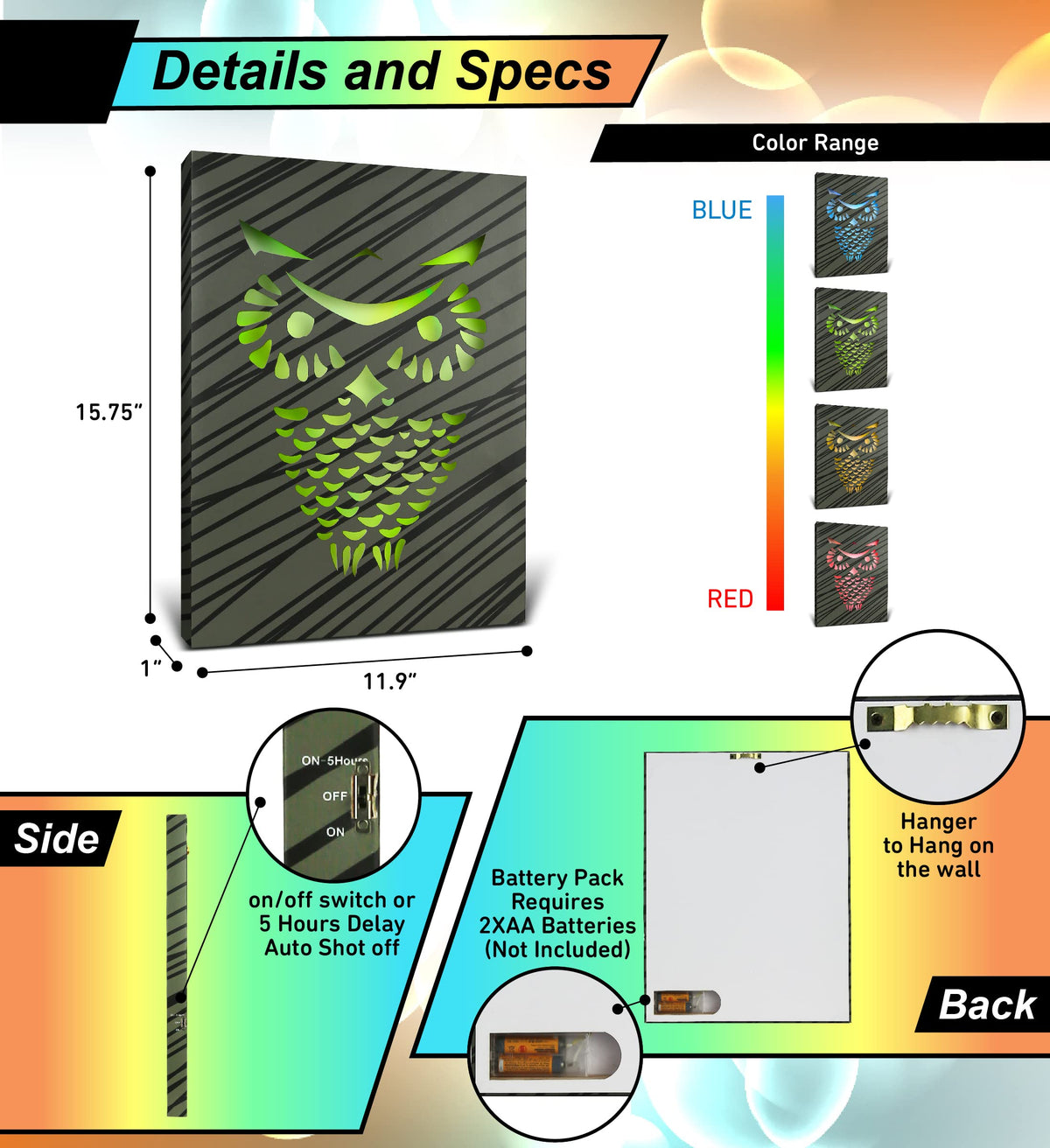 Add a stylish touch of LED light to your home decoration with this lovely Owl LED light up pictures for wall. The battery powered LED art for the wall makes the perfect accent for every plain wall and provides a soothing and elegant color changing warm light effect for indoor and outdoor spaces. It's the perfect gift for housewarming parties and can be hanged on any wall surface quite easily. Light up your bedroom, living room, and home decoration with this lovely color changing Owl LED Light Up Wall Art. It features a stylish laser-cut figure of an Owl and comes with LED lights that will provide a vibrant multicolored atmosphere to any room and space. The lightweight wall art for men and women is easy to hang and relocate wherever light is needed in your home. This stylish Owl led wall art accessory makes the perfect gift for teens and adults who like to add decorations for room to heir bedroom and home. This LED light art piece comes with an on/off switch that is easy to reach and will keep the color changing lights with constantly on or choose for 5 hours auto shot off. Illuminates warm light colors and creating a calming and soothing atmosphere that everyone will enjoy. This unique LED wall piece art is made with premium quality, resistant, durable materials and construction, and is meant to provide a stylish decorative accent and lighting to any indoor and outdoor space. The owl wall decorations art comes with long life integrated LED lights, and its lightweight construction makes it easy and convenient to hang and relocate. Includes 1 CoTa Global Owl LED Light Up Wall Picture Art work for home walls. The LED glow art picture comes with a laser-cut figure of an owl, and measures 15.75Lx11.9Wx1H inches. It features an on/off/5hr delay switch on the side for easy access, comes with a wall hanger, and requires 2 AA batteries (not included). Ideal light up wall pictures for hanging bedroom wall and other indoor spaces. Recommended for ages 12 and older.
