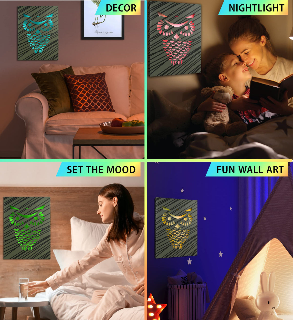 Cota Global Owl Light Up Led Wall Art - Fun Changing Color Led Light Up Picture Art For Bedroom, Modern Wall Hang Living Room Ar
