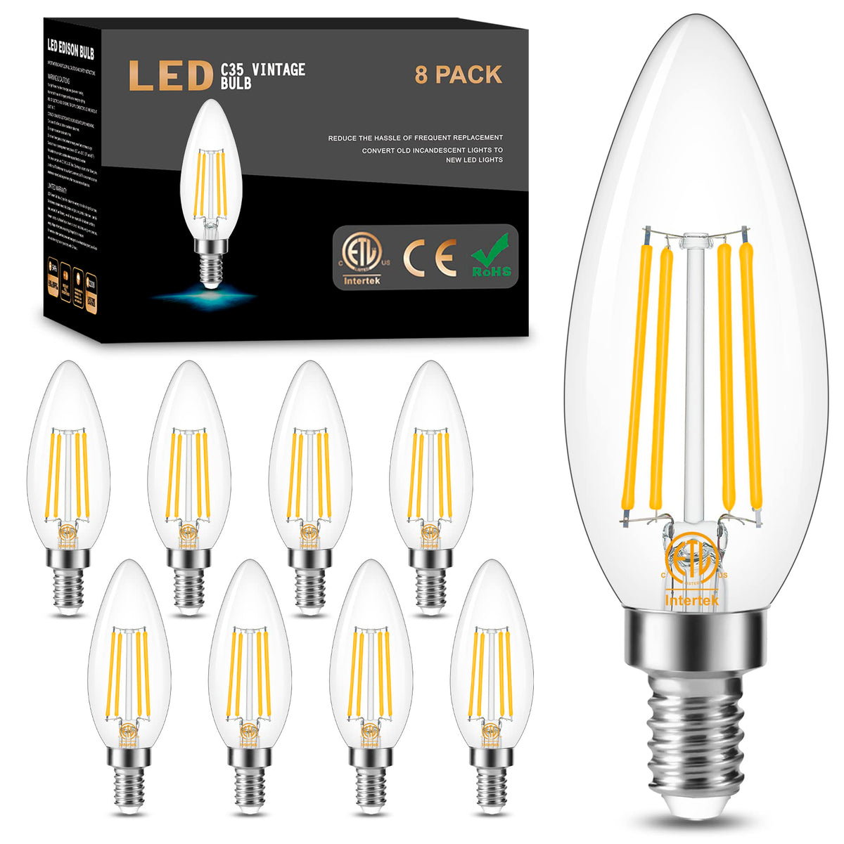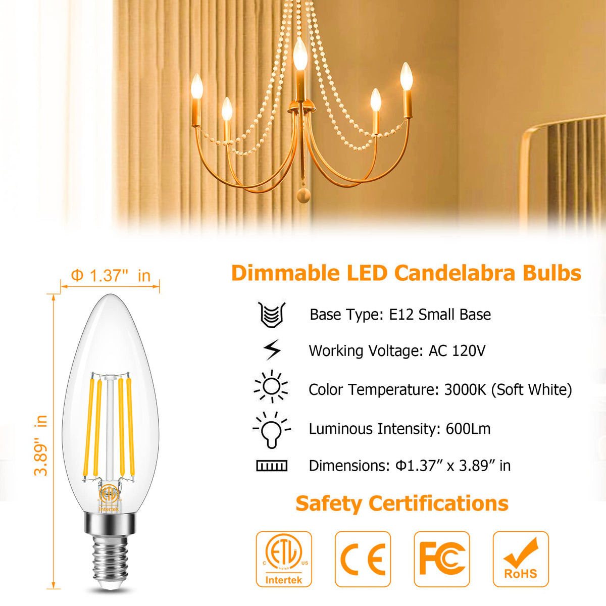 InformationPackage Include: 8 pcs C35 E12 LED Candelabra Bulb (Dimmable)Wattage: 4Watt (60Watt Traditional Bulb Equivalent) Base Type: E12 small baseDimmableLumen: 600LM Voltage: AC 85-265VBeam Angle: 360 degreeColor: 3000K Soft WhiteSize: 1.37 x 1.37 x 3.98 inchesLife Span: 30000hours FeatureLED bulbs can better replace incandescent and halogen bulbs. It has a steady current, no flickering, no noise. And it saves you electricity bills and time to replace bulbs.The candle shape is the best decoration and I think you need it for your crystal chandeliers, table lamps, wall light fixtures.Dimmable bulbs fit most of the E12 small base dimmers. You can adjust your light smoothly from 10% to 100%.Very easy installation, you just need to screw in the bulb after power off and it's installed.NoticeIf you have any questions we will answer for you. Please feel free to contact us, you are sure to get an answer within 24 hours.Please do not install it in exposed places outdoors, it is not waterproof.Please remember to turn off the power when installing!!!