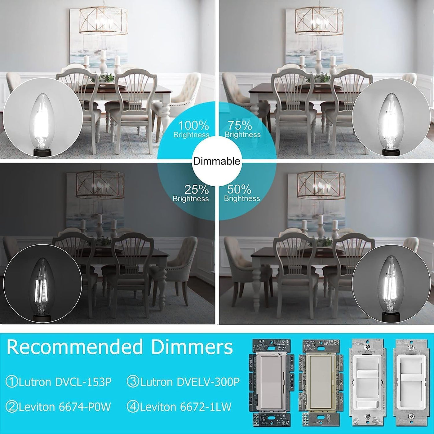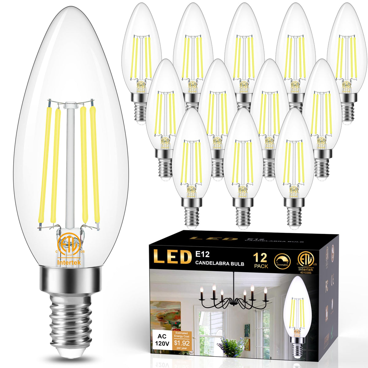 InformationPackage Include: 12 pcs C35 E12 LED Candelabra Bulb (Dimmable)Wattage: 4Watt (60Watt Traditional Bulb Equivalent) Base Type: E12 small baseDimmableLumen: 600LM Voltage: AC 85-265VBeam Angle: 360 degreeColor: 5000K daylightSize: 1.37 x 1.37 x 3.98 inchesLife Span: 30000hours FeatureLED bulbs can better replace incandescent and halogen bulbs. It has a steady current, no flickering, no noise. And it saves you electricity bills and time to replace bulbs.The candle shape is the best decoration and I think you need it for your crystal chandeliers, table lamps, wall light fixtures.Dimmable bulbs fit most of the E12 small base dimmers. You can adjust your light smoothly from 10% to 100%.Very easy installation, you just need to screw in the bulb after power off and it's installed.NoticeIf you have any questions we will answer for you. Please feel free to contact us, you are sure to get an answer within 24 hours.Please do not install it in exposed places outdoors, it is not waterproof.Please remember to turn off the power when installing!!!