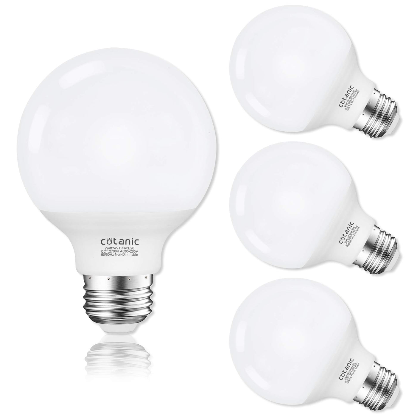 eature-Perfect replacement for your 60W matted incandescent light bulb-2700-Kelvin lighting color provides you with a cozy and warm atmosphere-Free from electromagnetic interference, the vanity light bulb is flicker-free-Fits all standard E26 screw base and easy to install with no need to use any tools-Ideal for vanity mirror, chandelier, bathroom, dressing room, wall sconce, pendant-High color rendering index (cRI 80+) brings out the reality color of objects around you Specification-Package: 4 pcs 5W Vanity Light Bulb-Incandescent Equivalent: 60 Watt-Base Type: E26 medium base-color: 2700K warm white-Size: 315 x 315 x 47 inches-Material: Aluminum & Plastic-Wattage: 5Watt-Non-dimmable-Lumen: 500LM-Voltage: Ac 85-265V-Life Span: 30000hours-Beam Angle: 270 degree cautions-Kindly remind you to switch off the power before installation-Please do not use them with dimmer, which may result in the flicker or damage of LED lights-Please keep the light bulbs away from direct sunshine and rainwater as they are not waterproof