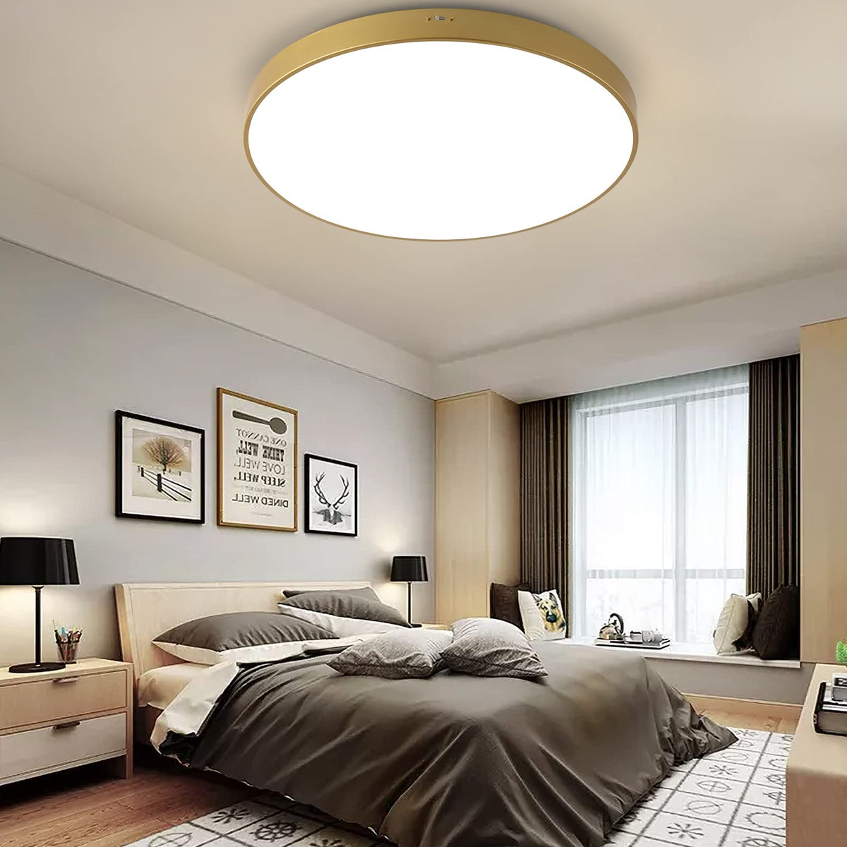 This ceiling light features a sleek 24-inch diameter and a low-profile design, making it suitable for spaces with low ceilings. The metal frame in an elegant gold finish adds a touch of sophistication, seamlessly integrating with contemporary decor. With a power output of 40W, this fixture delivers bright and energy-efficient lighting while maintaining a high Color Rendering Index (CRI) of 90+, ensuring that colors appear vibrant and true to life.