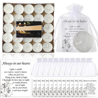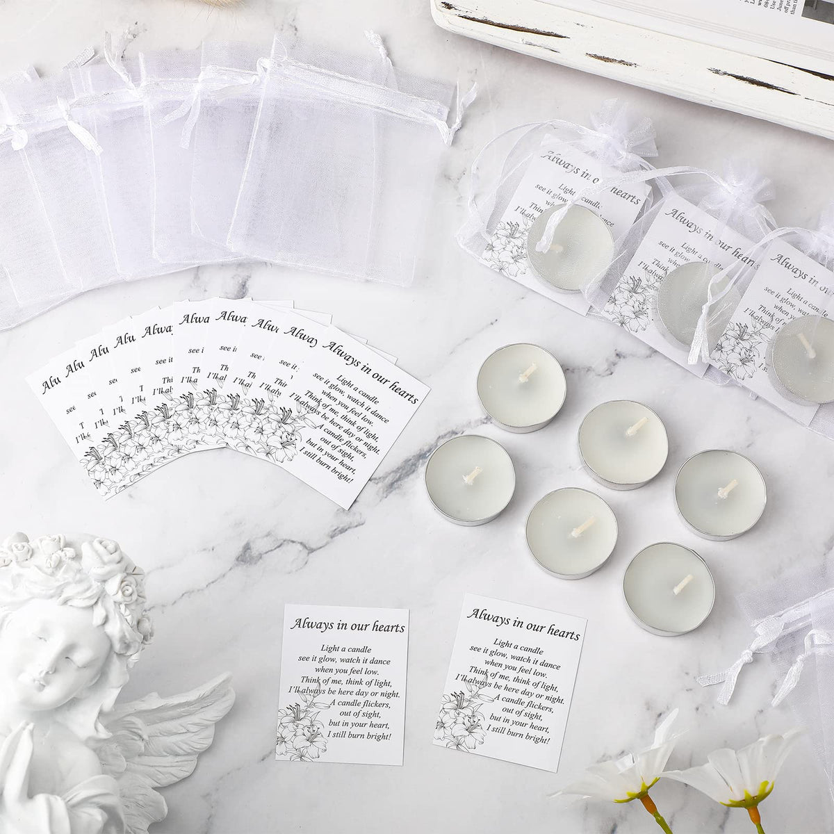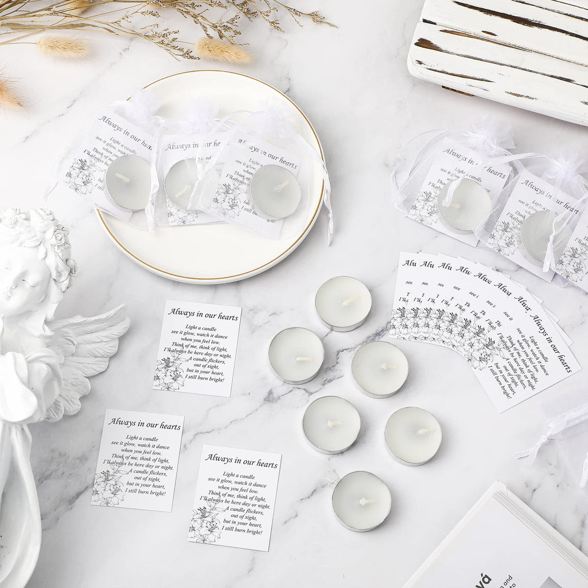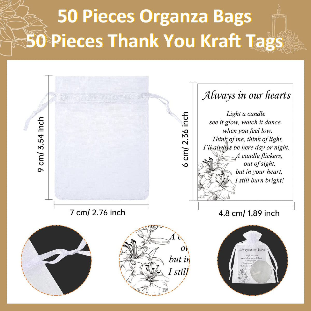 Coume 50 Set Funeral Favors Memorial Tealight Candles Unscented White Candles Funeral Gift Candles With Condolence Bereavement Cards And Organza Bags For Guest Furneral Party (Minimalist)