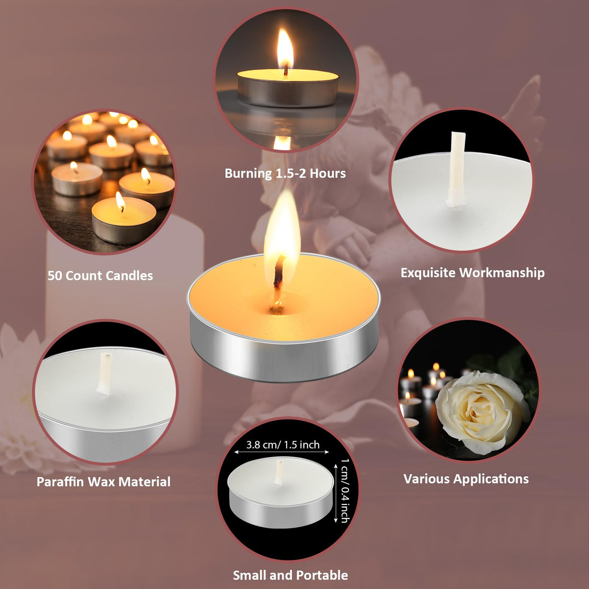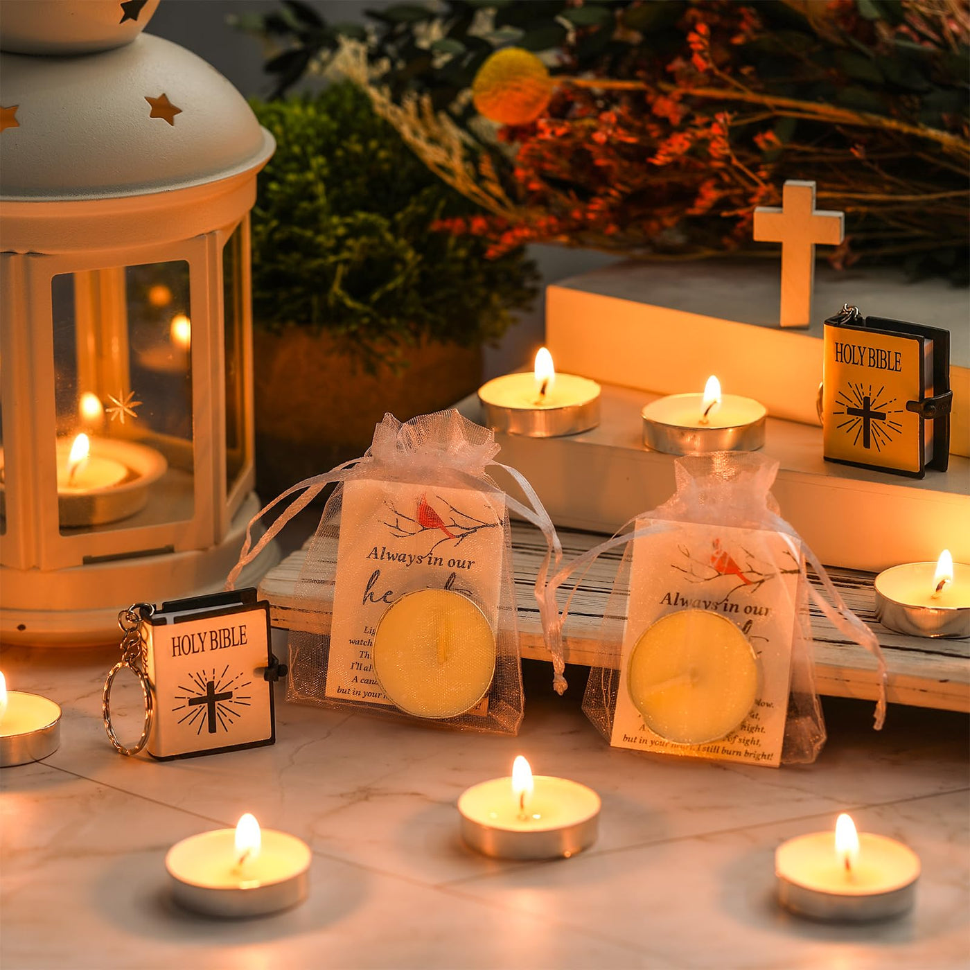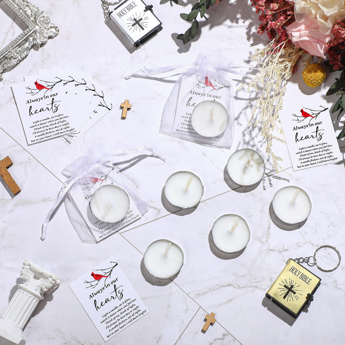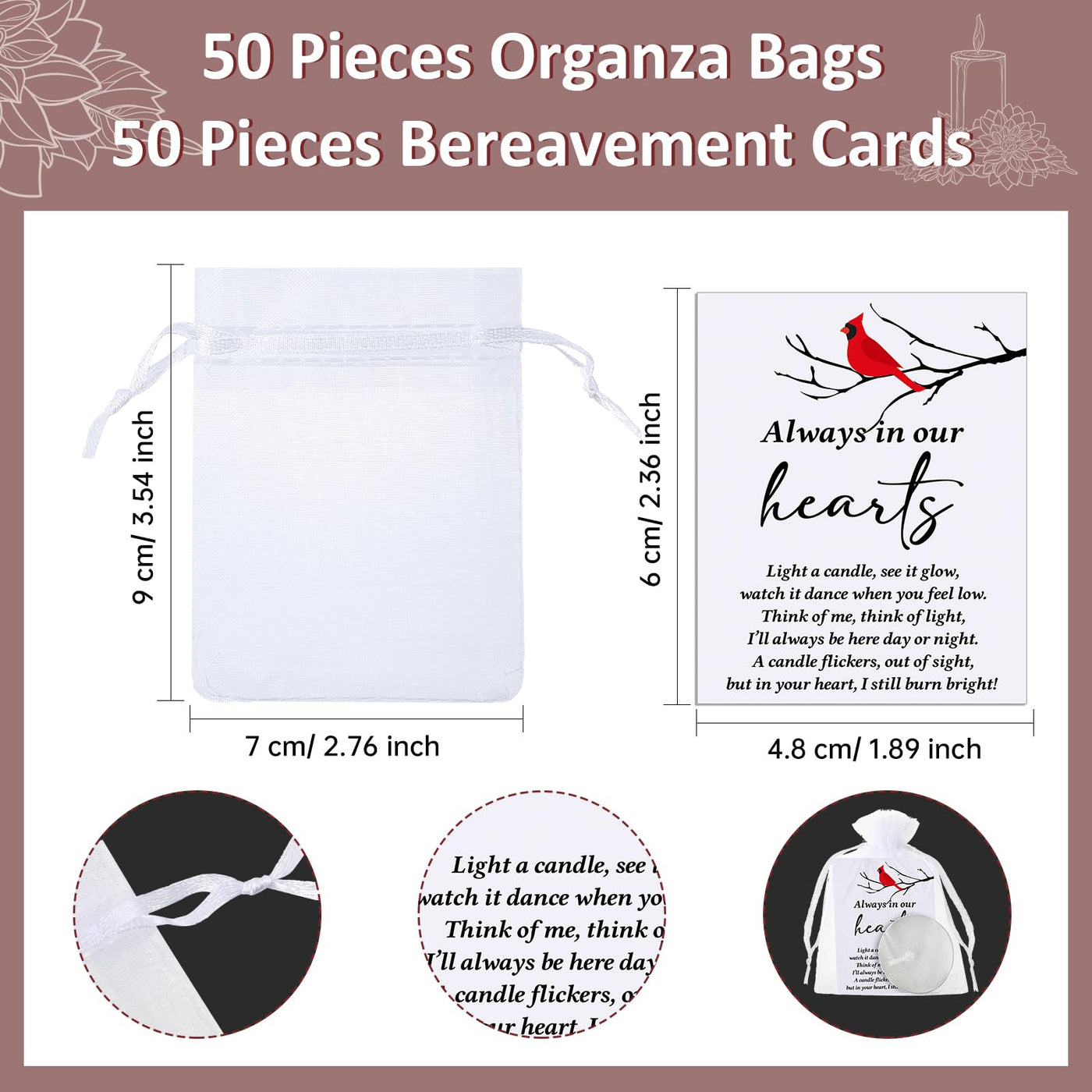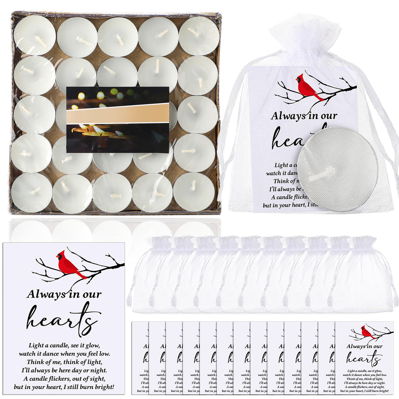 Coume 50 Set Funeral Party Favors Memorial White Candles Unscented Funeral Gifts Tealight Candles With Condolence Bereavement Cards, Organza Bags For Guest Celebration Of Life Decorations (Cardinal)