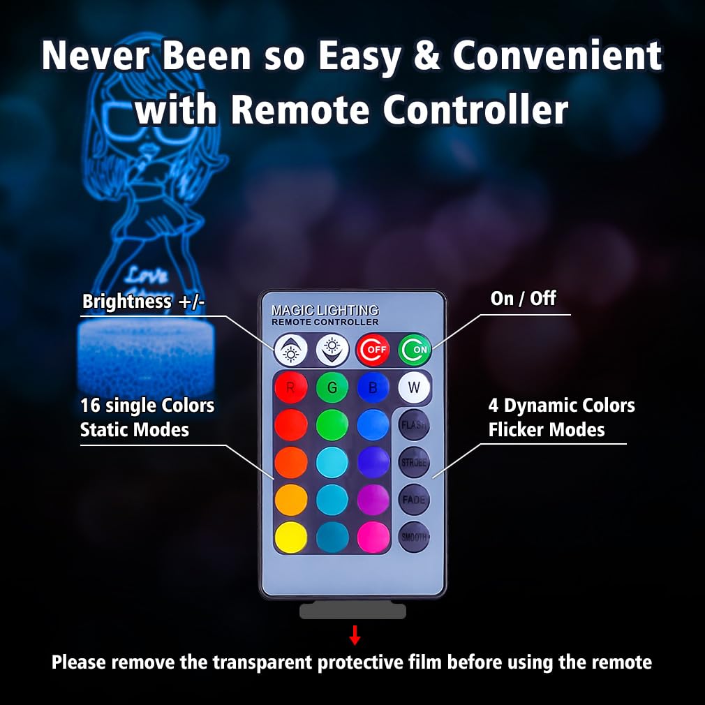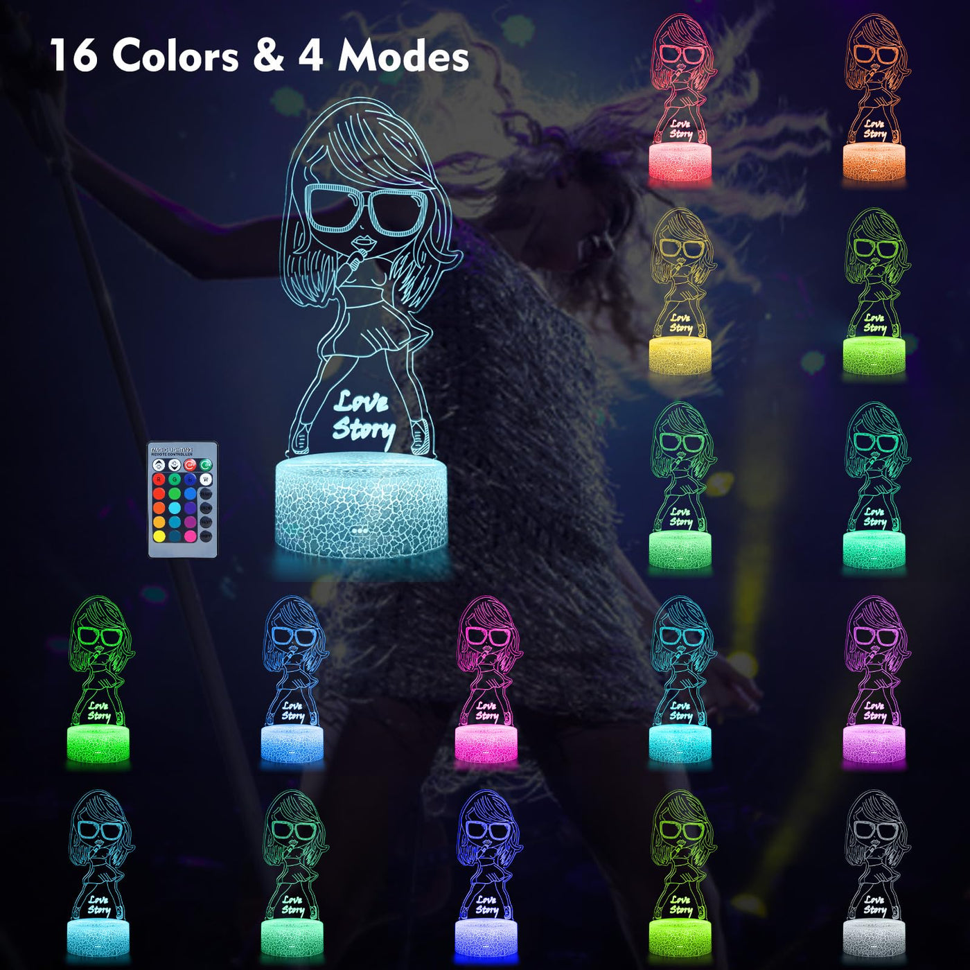 Singer 3D Night Light:The table lamp is made of high-quality acrylic and ABS materials, and the LED light is stable and eye-friendly. They deliver stunning, magical three-dimensional effects that seem to bring your favorite characters to life. Great Gift for Music Fans: lights are perfect gifts for girls fans.Whether it's Mother's Day, Christmas, Thanksgiving, New Year's, birthdays or other special occasions, these night lights will bring joy and surprise as a smart gift idea. Remote and Touch Control:It is very easy to use this stuff. The remote control can adjust 16 colors,4 flash mode and brightness of 3d night light. Touch the button on the light base to turn on/off and change the colors.Environmental Protection and Safety:The lamps use energy-saving LED light sources, which not only have a long service life, but also reduce energy consumption. The power spend: 0.012kw.h/24 hours, LED life span: 10000hours. fans merch stuff toys gifts for girls girlfriend birthday party decorations room decor led lamp kids 3d night lights for bedroom merchandise