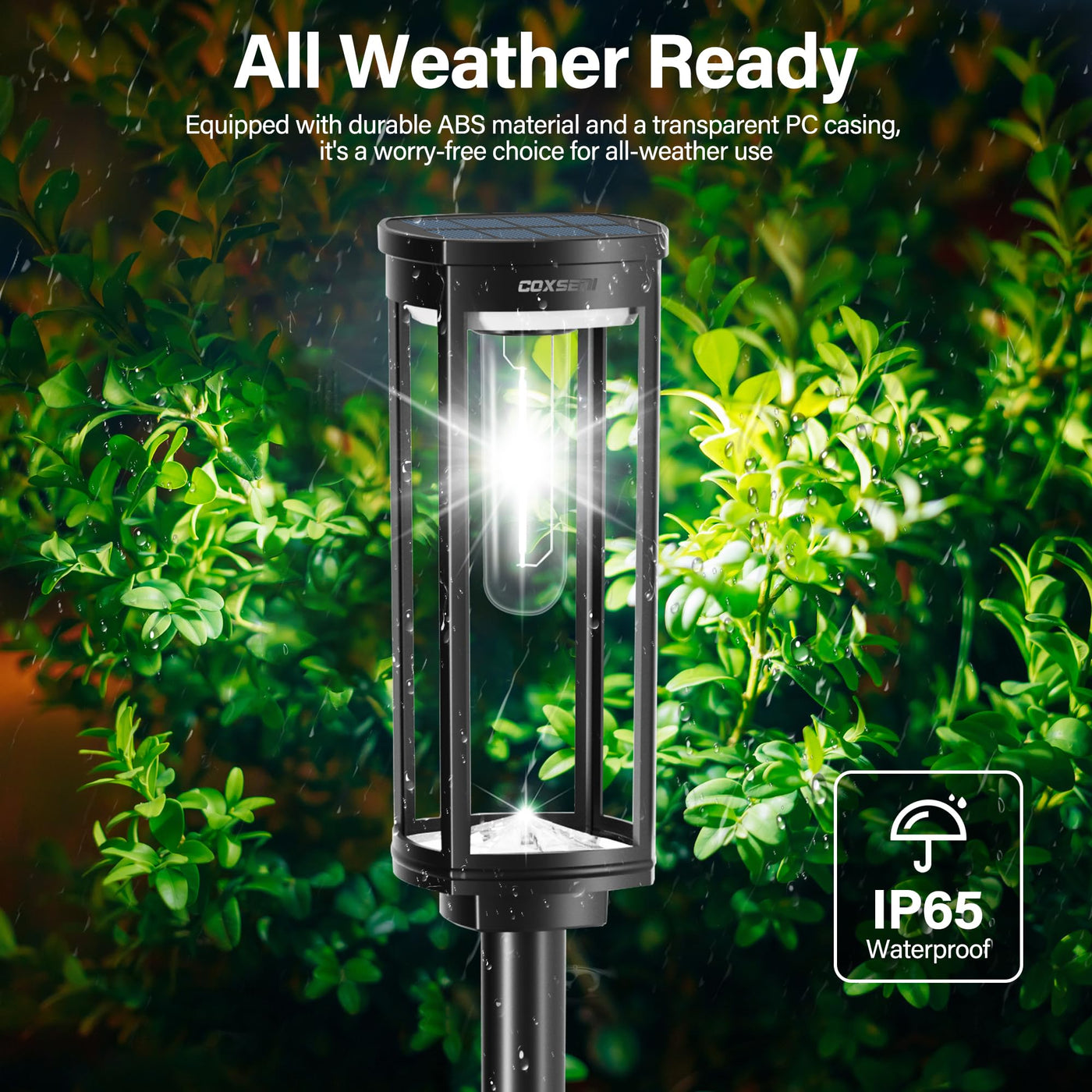Why Choose Coxseni Outdoor Solar Pathway Lights Outdoor Waterproof? 12H Super Long Lasting: Increase 30% Working Time Compared To Others. Ip65 Waterproof: No Need To Worry About Bad Weather. Easy And Quick Installation: No Tools And Wiring Required, Easy To Use 6500K Cool White Light: Brighter And Cozier Cool White Light Creates A Romantic And Comfortable Atmosphere Widely Application Scene: Retro Design With Warm White Light Complements Patios, Gardens, Porches, Paths, Driveways, Etc. Solar Powered Outdoor Lights Are The Perfect Way To Outdoor Decoration And Enhance The Holiday Atmosphere.