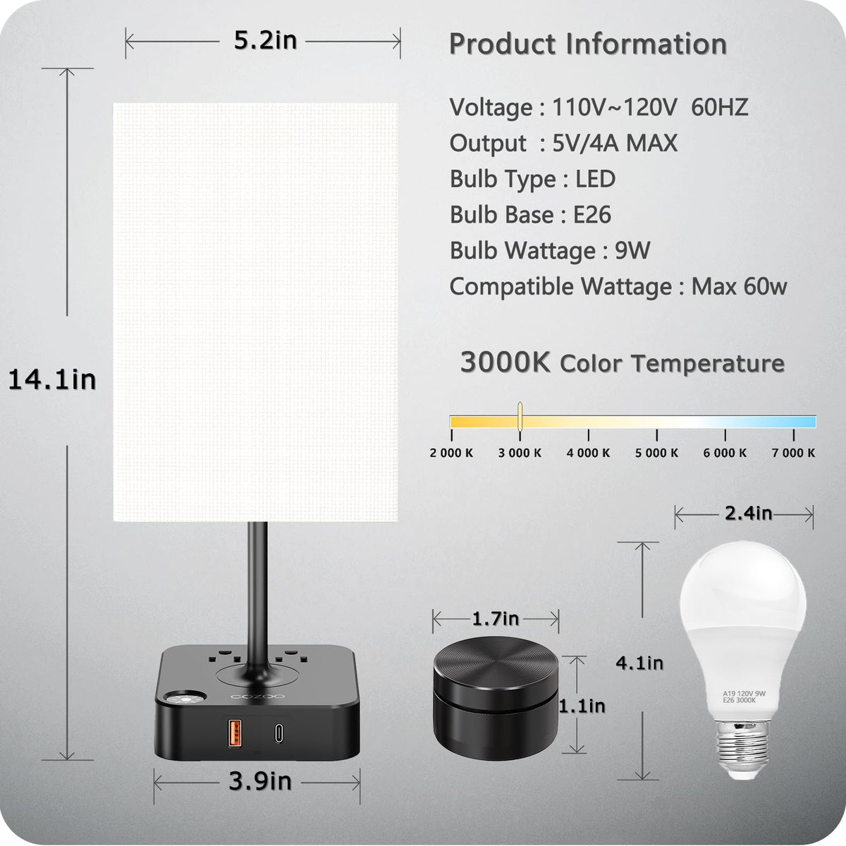 Q: What are the unique features of the COZOO Bedroom Table Lamp?A: The COZOO Bedroom Table Lamp includes built-in 2 USB charging ports and 2 AC outlets, a high-end fabric lampshade, and a 9W LED dimmable remote-control bulb. It allows for convenient remote operation from up to 33 feet away, offering adjustable brightness and dual control methods via remote and touch switch.