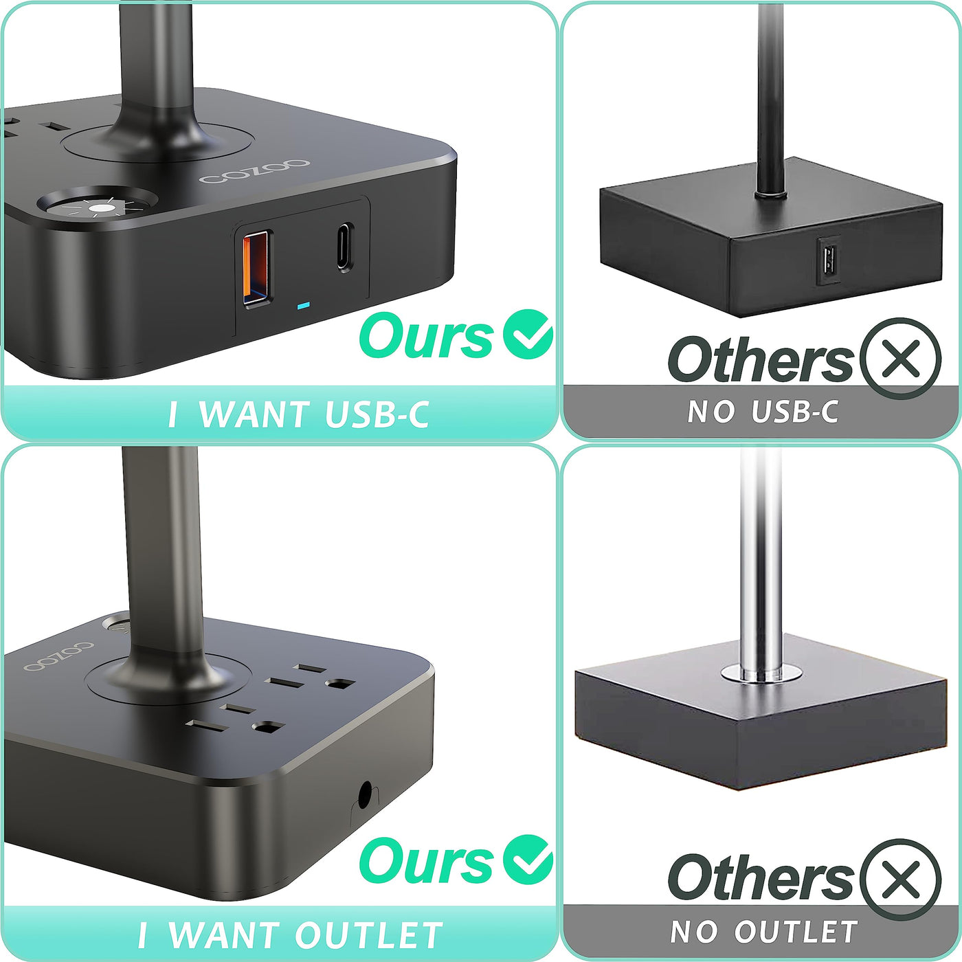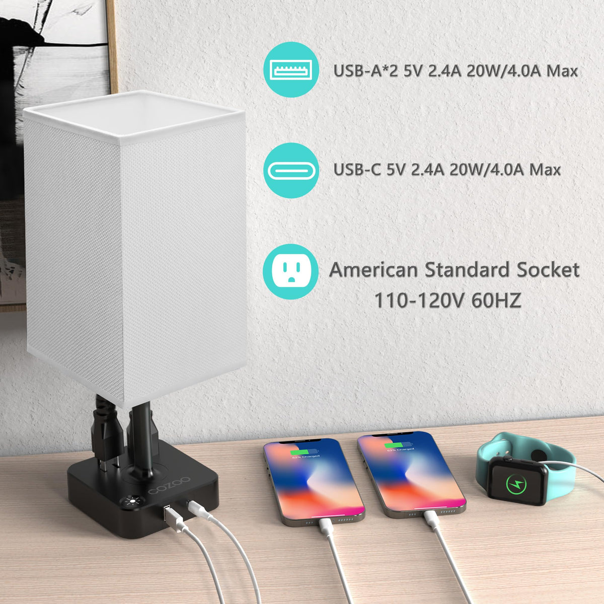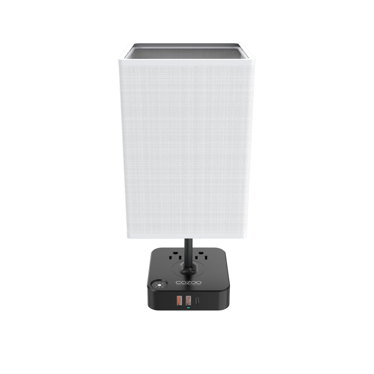 Cozoo USB Bedside Table & Desk Lamp, 3 USB Ports, 2 Outlets, Large White Fabric Shade, Model MC003