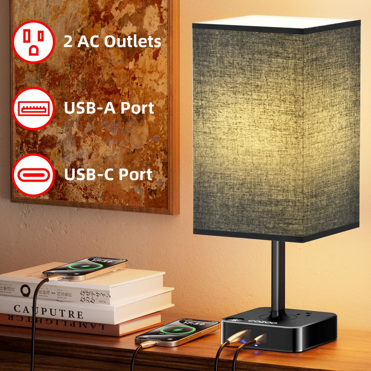 Q: What are the charging capabilities of the Cozoo USB Bedside Table Desk Lamp?A: The Cozoo USB Bedside Table Desk Lamp features 3 USB ports and 2 AC outlets, allowing you to charge multiple devices simultaneously. The USB ports work independently of the lamp being on or off, providing a total output of DC 5V 4.0A (max).