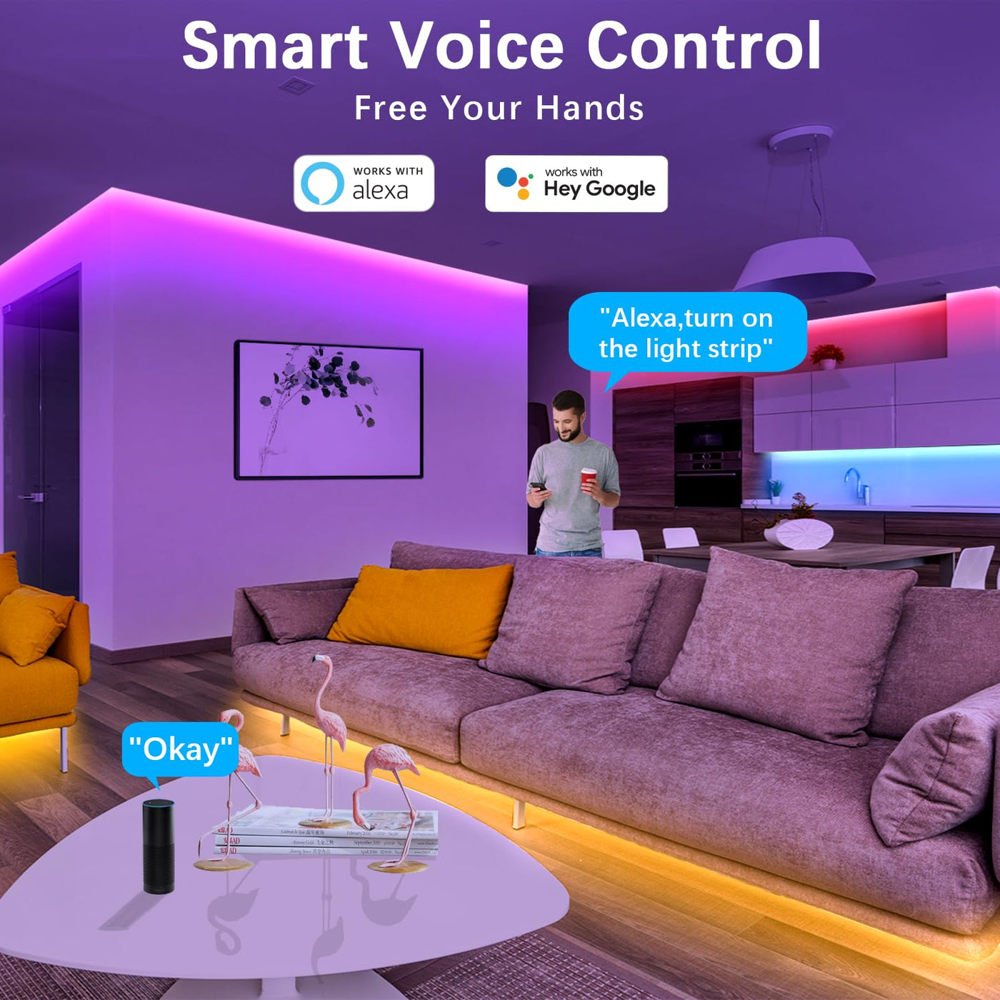 - **Voice & Smartphone Control**: Compatible with Alexa and Google Assistant, control your LED strip lights effortlessly via voice commands. Adjust colors, brightness, and power from anywhere, ensuring you have the perfect ambiance at your fingertips. (Note: Does not support 5G WiFi; voice devices not included.)
