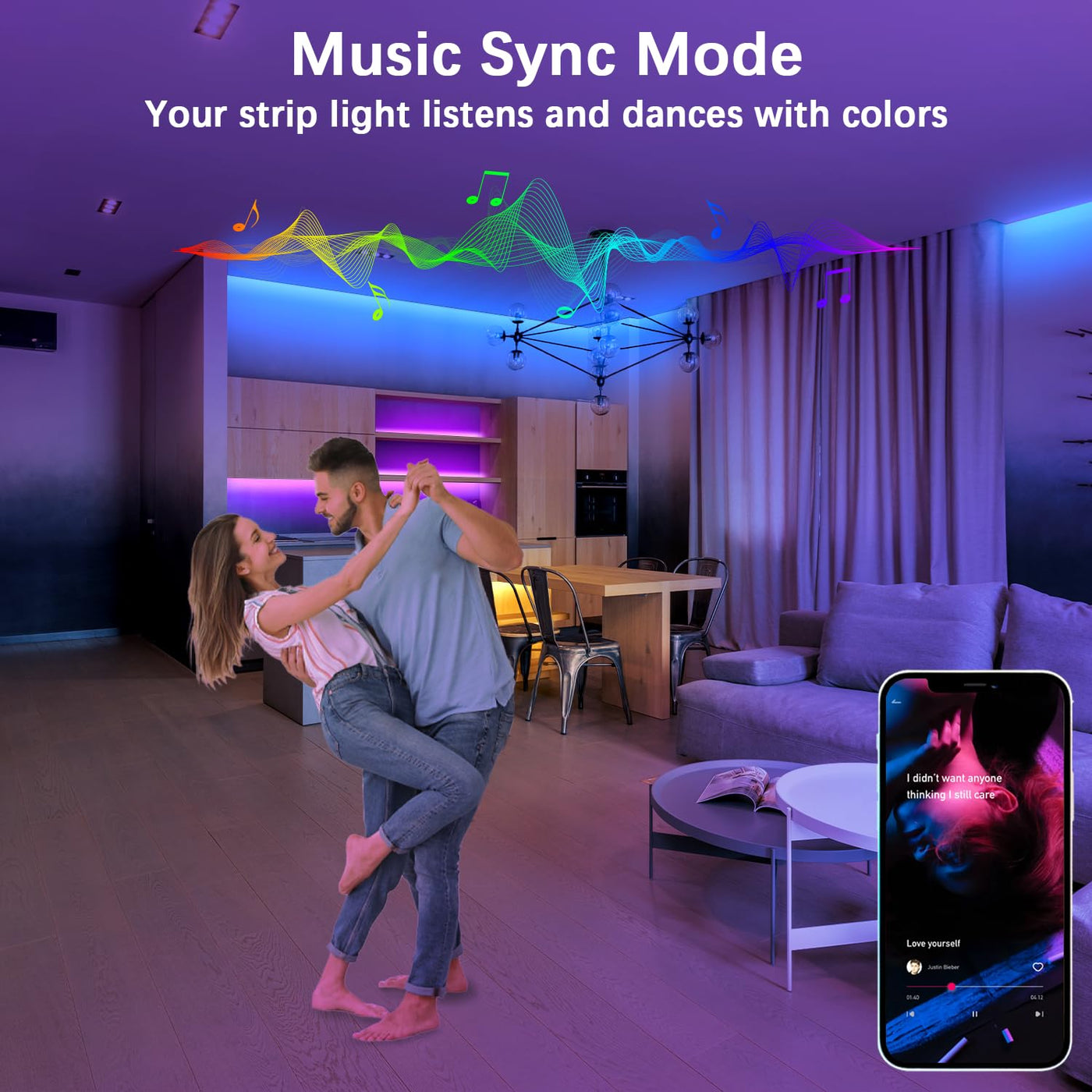 - **Sync to Music**: Equipped with a built-in microphone, the LED light strip responds to ambient sound, flashing and changing colors in harmony with your music beats. Perfect for game rooms, bars, personal bedrooms, and more, it brings any space to life.