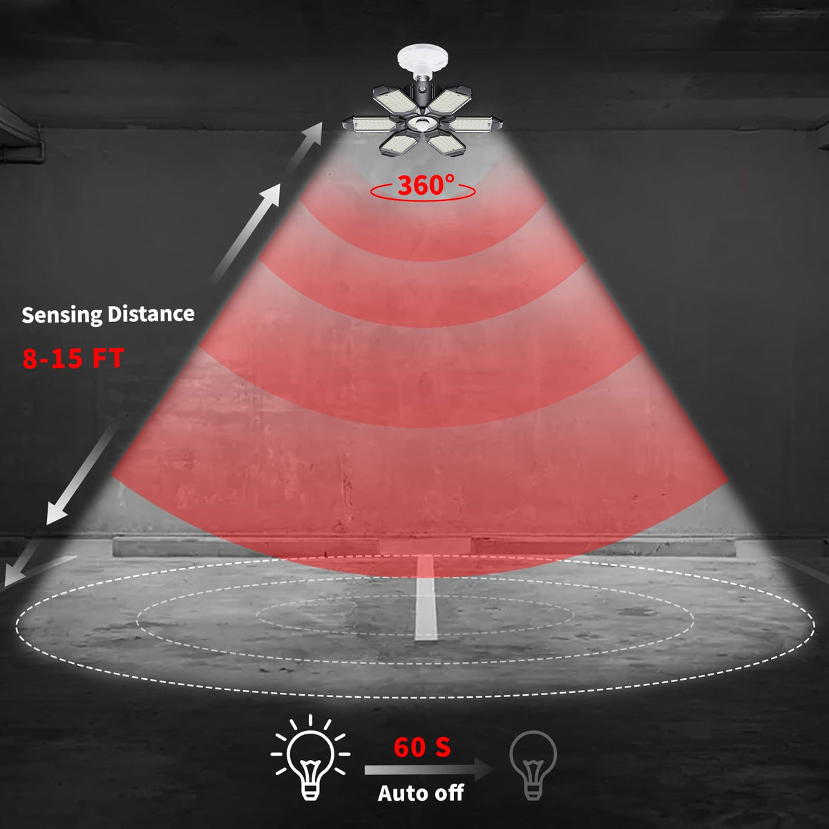- **Versatile Use Cases**: Ideal for garages, barns, utility rooms, warehouses, shops, basements, high ceilings, and more. This motion sensor light is perfect for any environment requiring reliable and bright lighting, including logistics centers, exhibition halls, gyms, and parking lots.