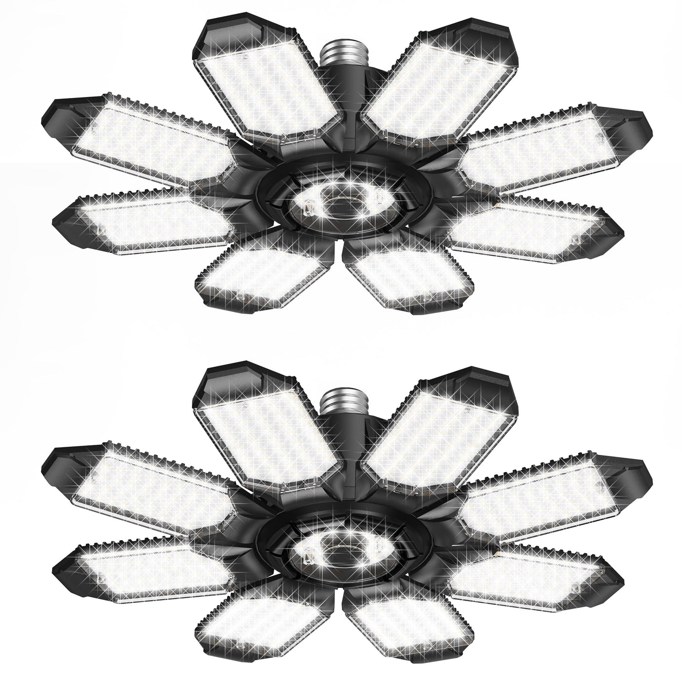 Q: What are the features of the adjustable panels on the garage lights?A: The garage lights feature 8 deformable multi-position panels that can be adjusted up to 90°, allowing you to customize the lighting effect for focused or flood lighting in any direction.