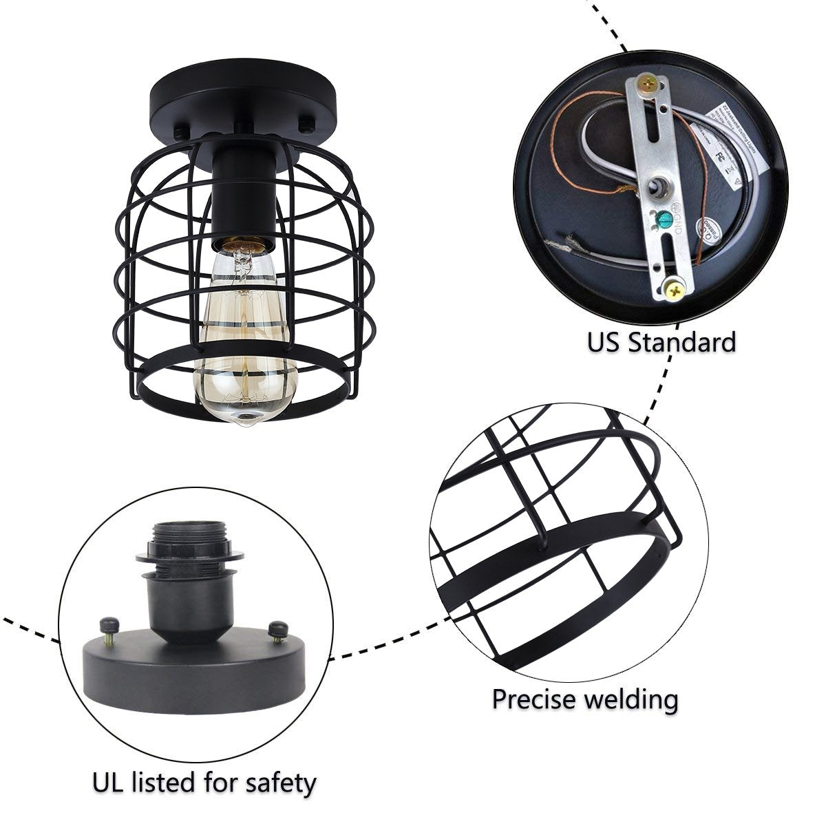 Create For Life® Industrial Vintage Flush Mount Ceiling Light,Rustic Metal Cage Pendant Lighting Lamp Fixture For Hallway Stairway Kitchen Garage, E26, Black Painting Finish