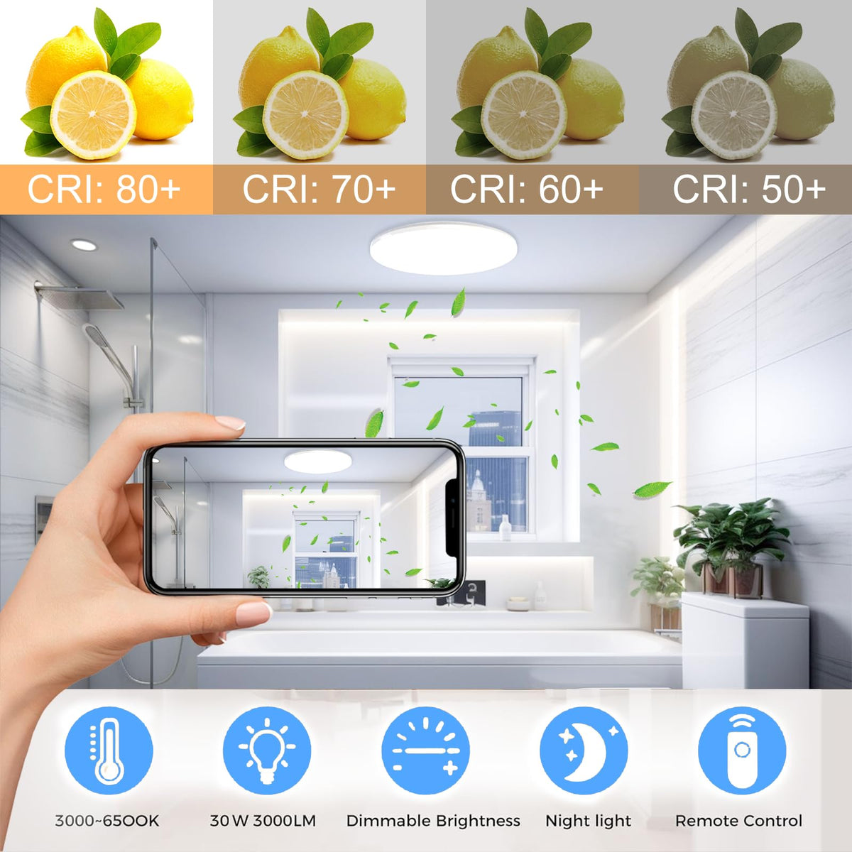 Led Light, 12 Inch 30W Flush Mount Ceiling Fixture, Round Lamp Remote Control 3000K-4500K-6000K Dimmable White Light Frosted Surface For Modern Bathroom Laundry Bedroom Hallway Livingroom Office