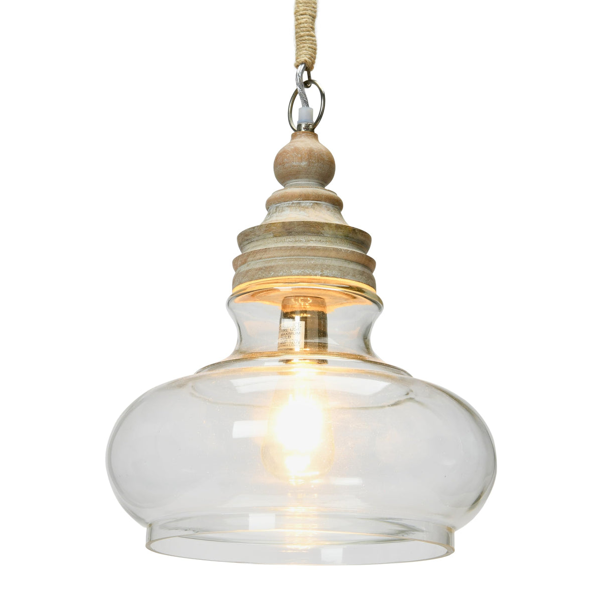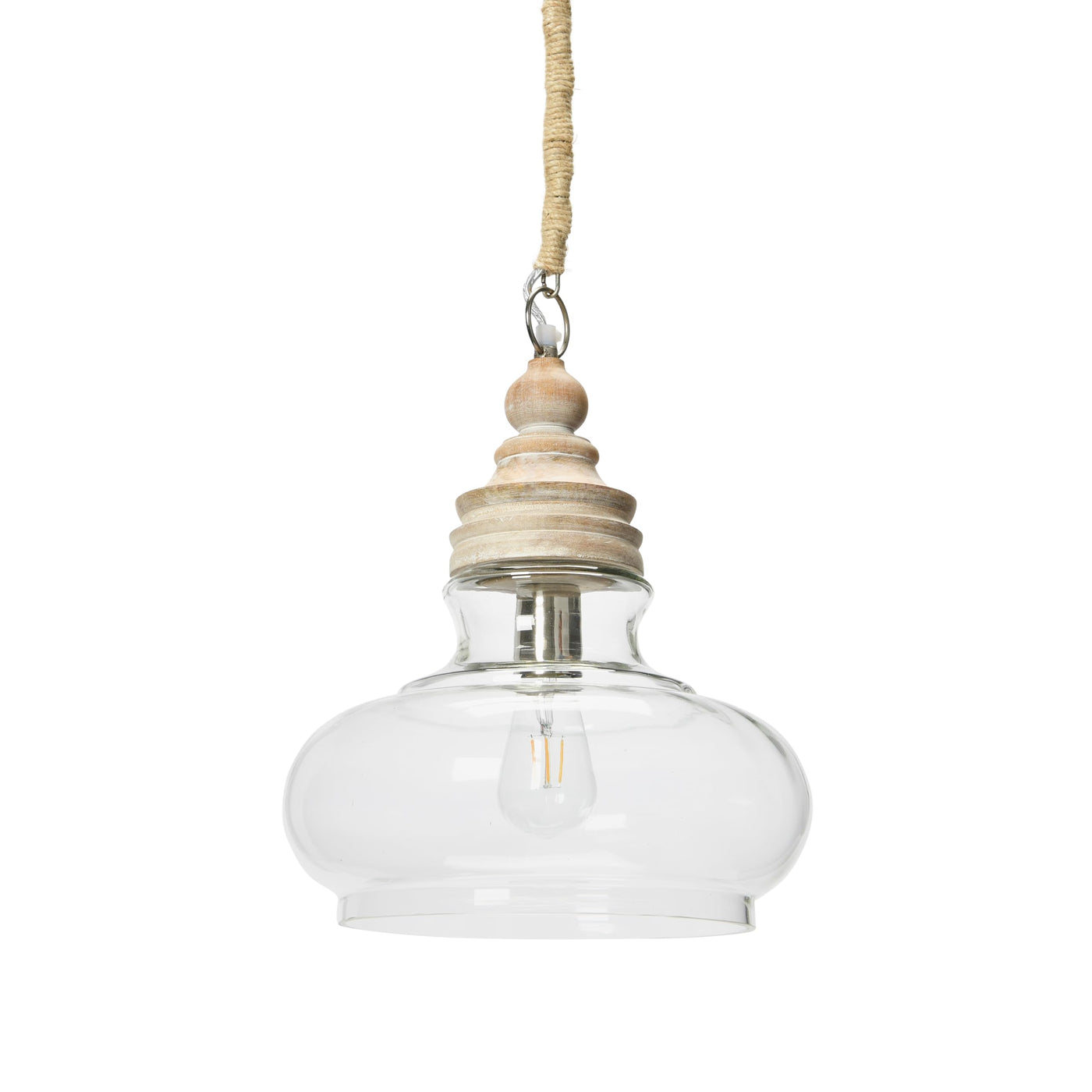 Glass andMango Wood Pendant light- A perfect piece for your home. This light fixture comes with an elegant design to create a blend of elegance andmodernity in your house. The hanging light can be used individually or can be used in a set. The detailing creates a mix of modern andtraditional. Letting your house be a reflection of your personality Pendant lights can be your most trusted partner when it comes to lighting up a space. It can be a reflection of personality that can standout in a crowd. With its round opening, it speaks of sophistication while the rope detailing adds an earthy touch to this piece. It is a piece that can serve as the perfect farmhouse light fixture. Let this piece be a great conversation starter Let this pendant light serve as great conversation starter in the middle of gatherings. Let there be light all around as you sit with friends in the cozy winter evenings.