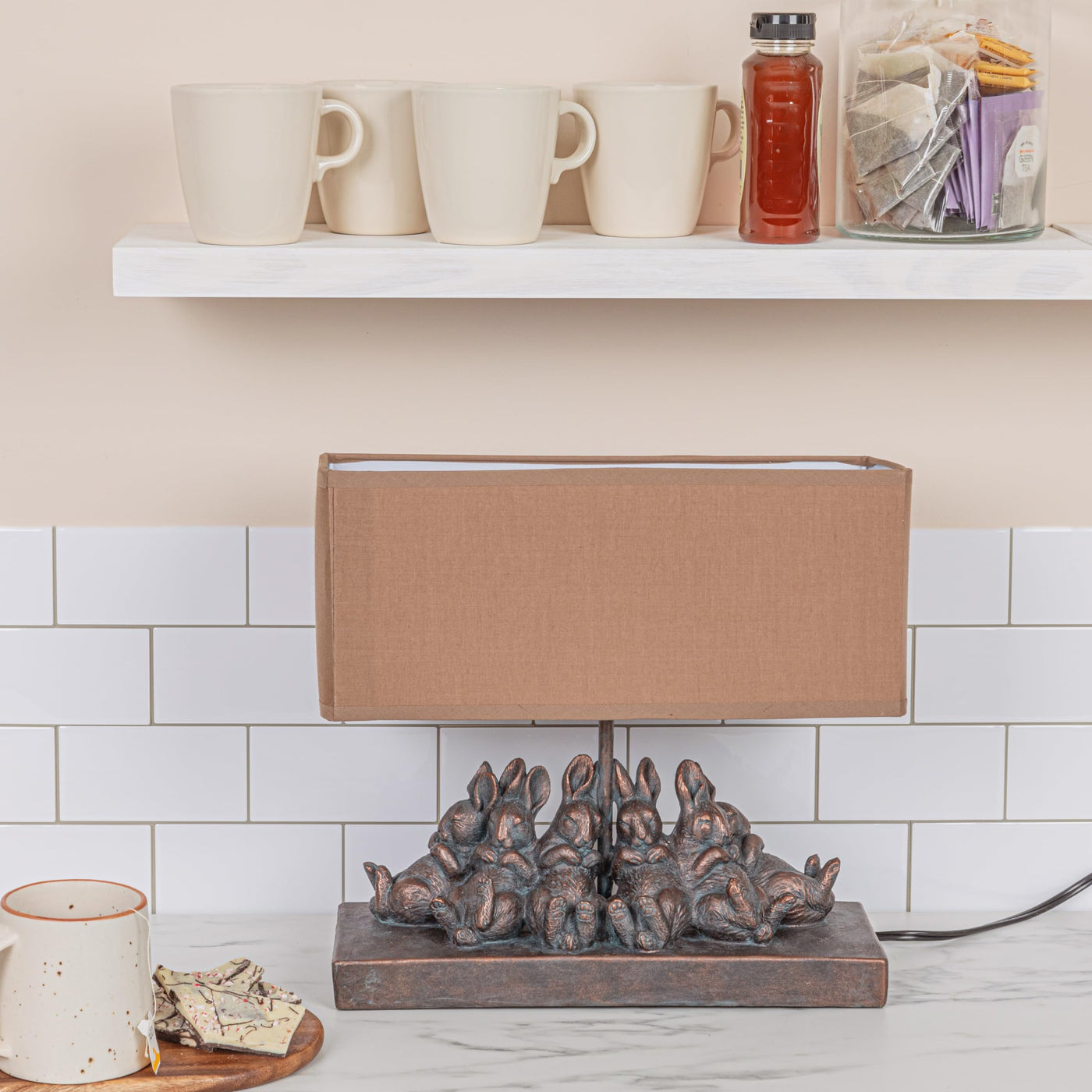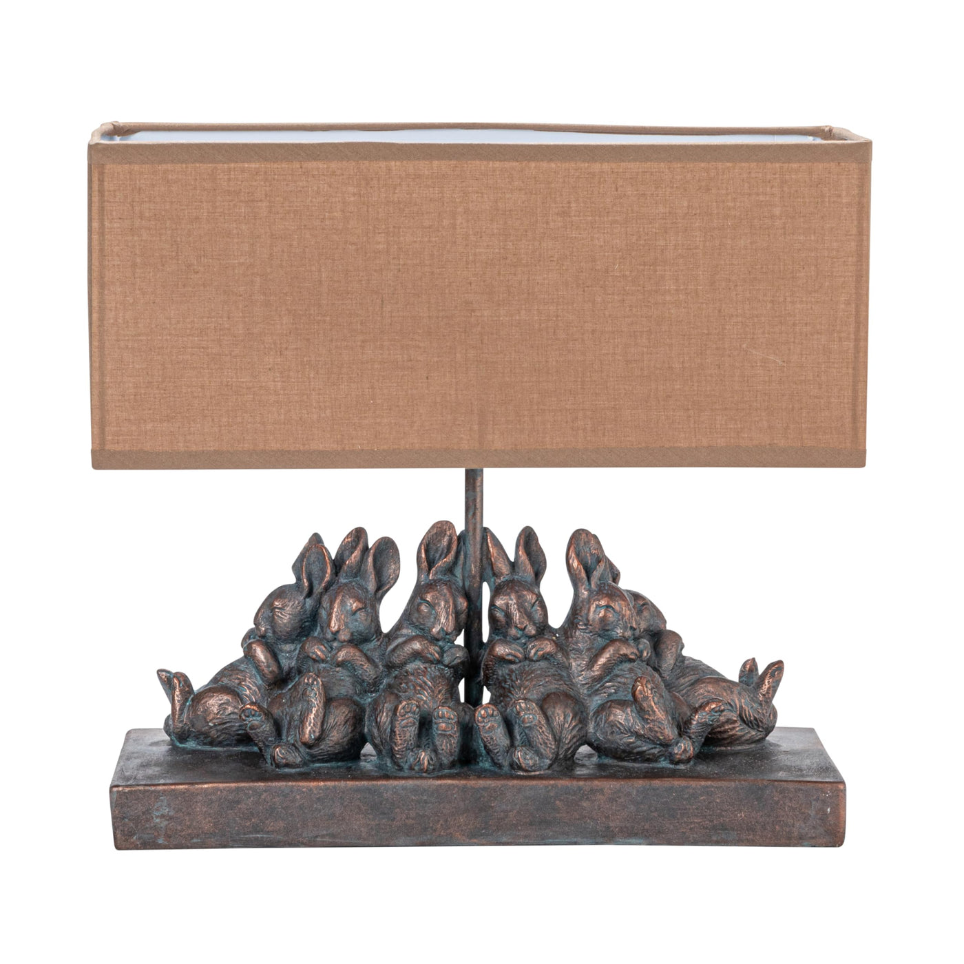 Add Style And Personality To The Space With This Bronze-Finish Resin Rabbit Table Lamp. This Table Lamp Showcases A Resin Base With Adorable Rabbits In Different Poses. The Rabbits Add A Touch Of Contrast And Whimsy To The Lamp. The Lamp Is Topped With A Rectangular Linen Shade In A Sand Color That Creates A Cozy And Inviting Atmosphere. This Table Lamp Is Suitable For Enhancing Any Style Of Home D?Or, From Rustic To Farmhouse . Use It In The Living Room, Bedroom, Office, Or Any Other Area That Needs Some Extra Fun And Brightness.
