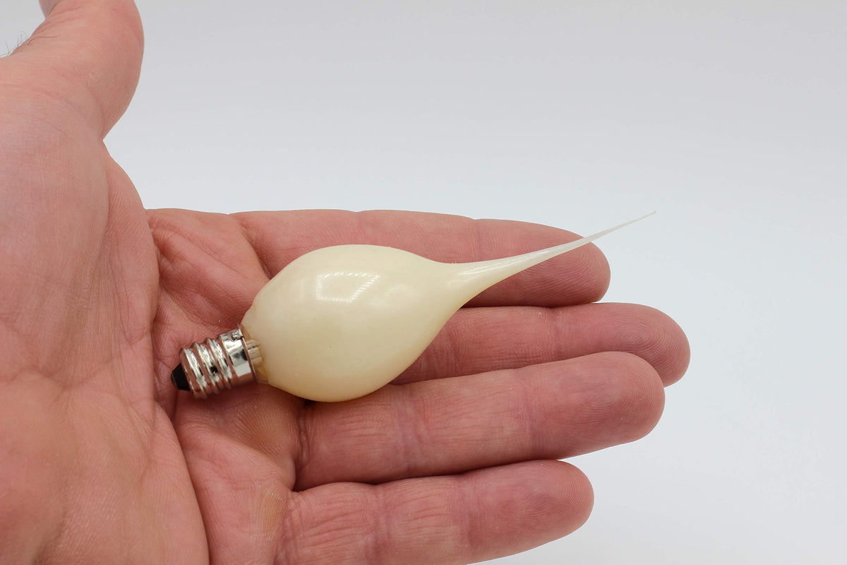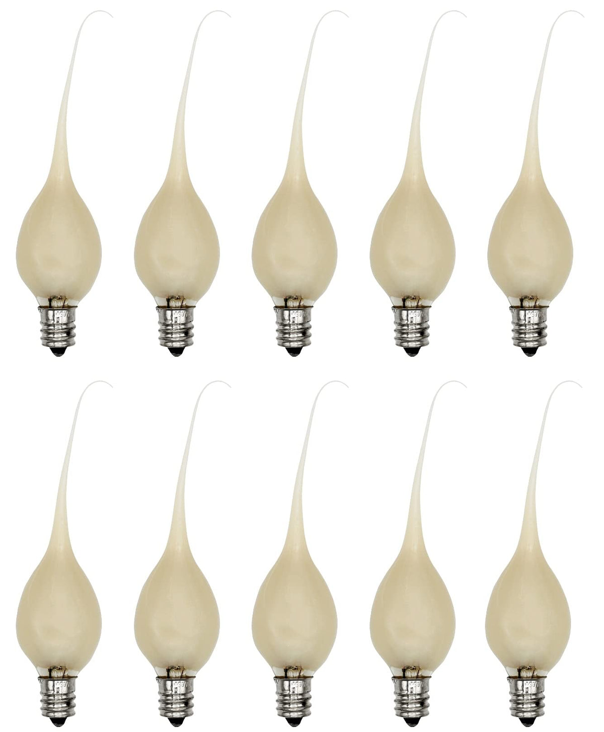 Once you use these light bulbs you will never go back to plain old boring clear light bulbs again. These bulbs have a dramatic country look and add down-home charm to electric candle creations, accent lamps or country style lighting applications. Steady-burning 5 watt bulbs are hand dipped in a pearlized gold silicone coating that produces a flexible, tapering, flame-like appearance. Light travels throughout the coating to the very tip and imparts a charming appearance to the bulb. The best part is the bulbs look attractive when unlit! The bulbs have a candelabra base and are for indoor use only. You get a total of 10 bulbs in this offer.