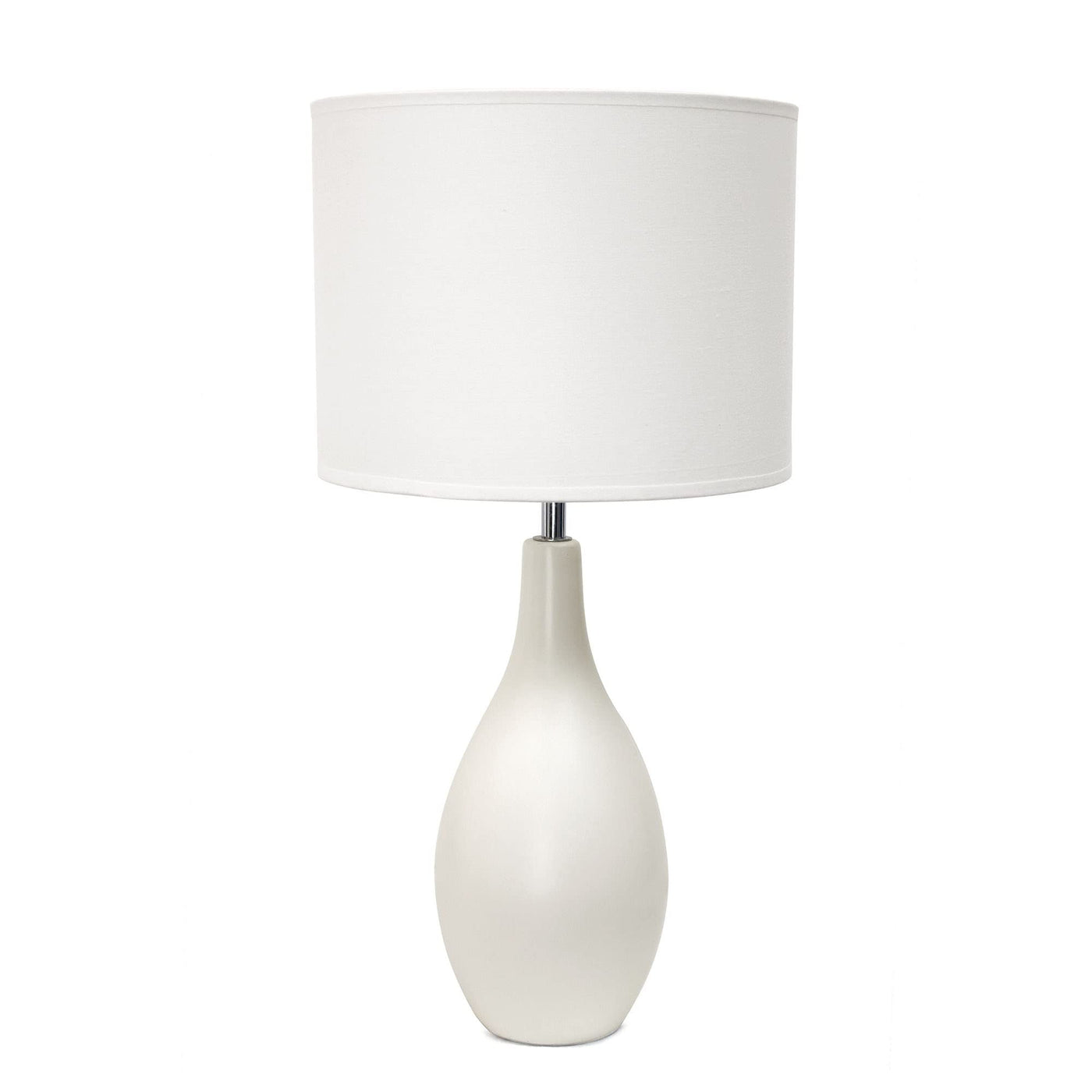 This traditionally designed table lamp is available in a smoothly painted finish of your choice, shaped similarly to a dewdrop and paired with a matching fabric drum shade. Due to its simplistic yet sophisticated design, this lamp is ideal for any space and many different styles of decor. Available in a variety of color options, this lamp is sure to suit your lighting and decor needs all in one!. Includes 1 x drum shape off white fabric shade to match the base. Includes 1 x off white smooth finished ceramic base. Features a 5' white plug in cord with an in-line gear (rotary) switch. Requires 1 x 60 watt type A19 medium based bulb (not included). Shade measures Dia: 9.4" x H: 7". Lamp shade is secured with a provided socket nut. Does the item contain wood: No. Height from Base to Shade: 11.25". Height from Base to Socket + Socket: 11.1".