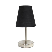 This timeless styled table lamp is unique to its size, standing at just 10.5" tall to sit perfectly atop your bedroom nightstand, end table, college dorm desk, or child's room. A round bottom sand nickel stick base is fixed beneath a standard empire fabric shade in a number of different color options to compliment your space as needed. You'll find the perfect shade color option to suit your decor needs in no time. . Includes 1 x empire shaped fabric shade that secures to the base using a socket nut. Includes 1 x petite sand nickel stick lamp base. Features a 5' black plug in cord with an in-line on/off switch. Requires 1 x 40 watt type B10 candelabra based bulb (not included). Shade measures Dia: 4.92" x H: 5". Comes in a variety of shade color options. Does the item contain wood: No. Height from Base to Shade: 5.12". Height from Base to Socket + Socket: 5.75".