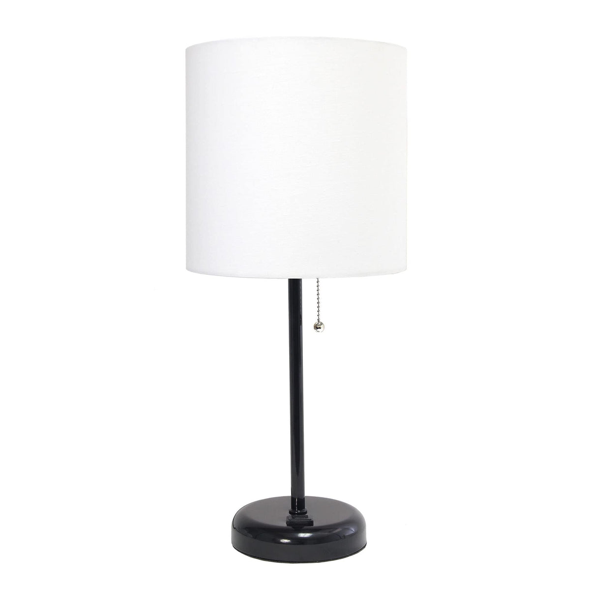 Q: What materials is the lamp made of, and what is the shade type?A: The lamp features a black metal base and a white drum-shaped fabric shade. The material breakdown includes 69% iron, 25% fabric, and 6% plastic.